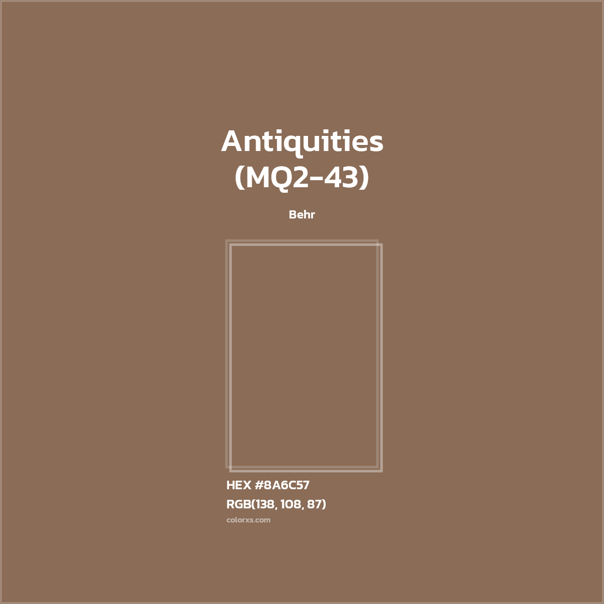 Antiquities (MQ2-43) color belongs to the Neutral color family (hue). The hexadecimal color code(color number) for Antiquities (MQ2-43) is #8A6C57, and the RGB color code is RGB(138, 108, 87).