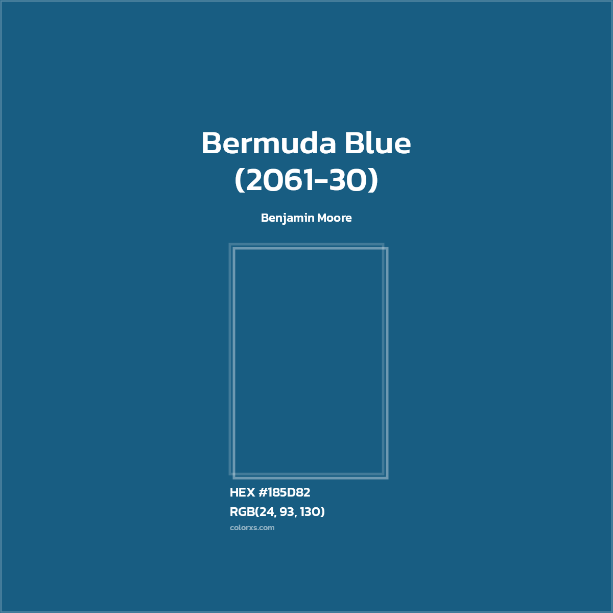 Bermuda Blue (2061-30) color belongs to the Blue color family (hue). The hexadecimal color code(color number) for Bermuda Blue (2061-30) is #185D82, and the RGB color code is RGB(24, 93, 130).