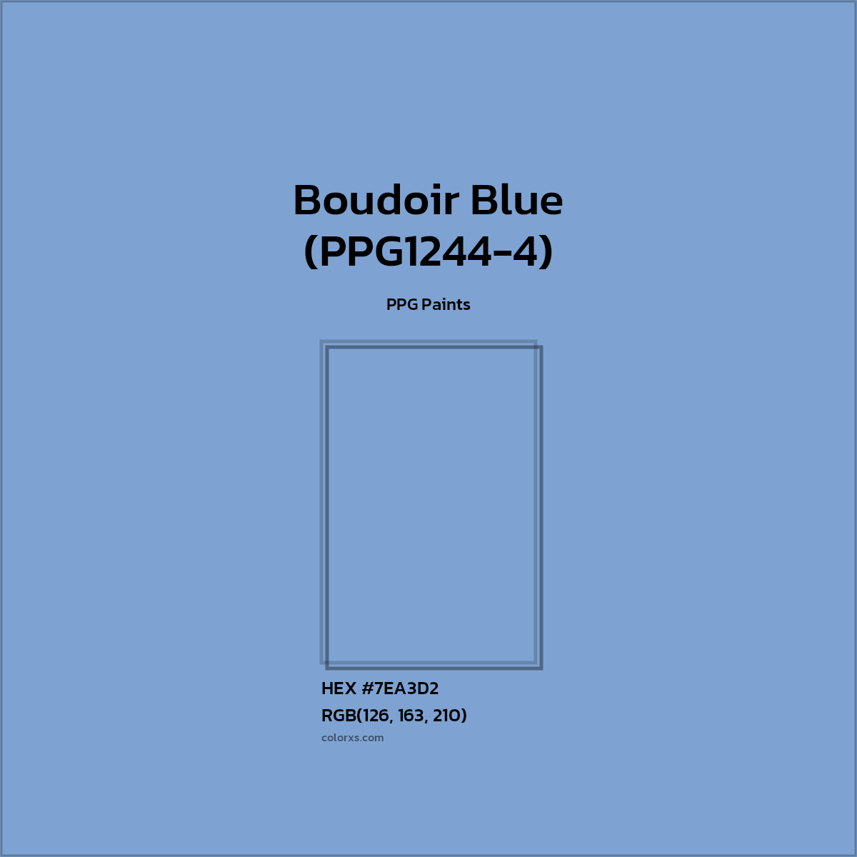 Boudoir Blue (PPG1244-4) color belongs to the Blue color family (hue). The hexadecimal color code(color number) for Boudoir Blue (PPG1244-4) is #7EA3D2, and the RGB color code is RGB(126, 163, 210).