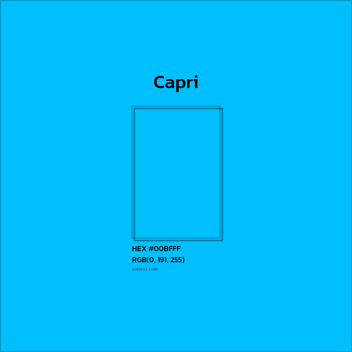 Capri color belongs to the Blue color family (hue). The hexadecimal color code(color number) for Capri is #00BFFF, and the RGB color code is RGB(0, 191, 255).