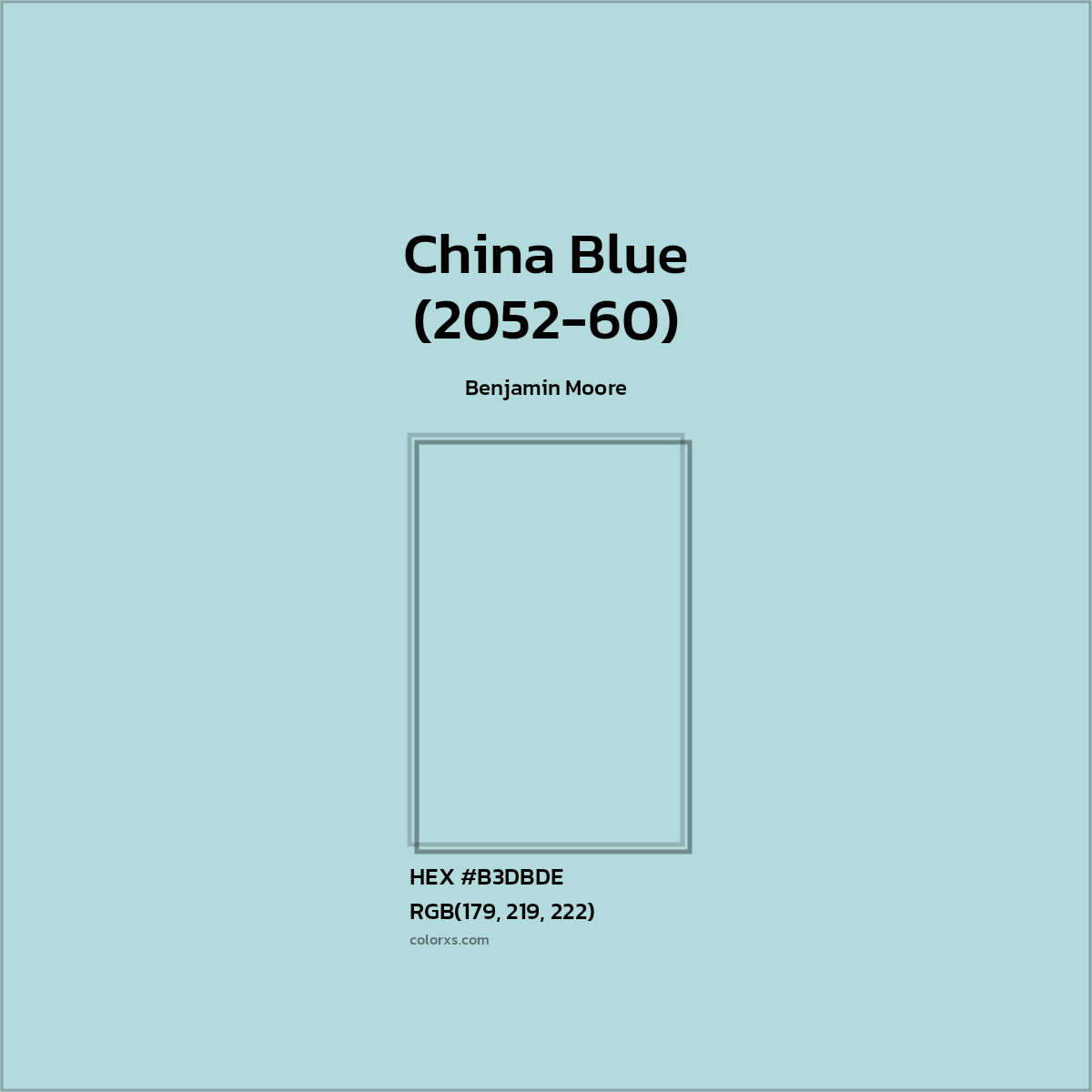 China Blue (2052-60) color belongs to the Blue color family (hue). The hexadecimal color code(color number) for China Blue (2052-60) is #B3DBDE, and the RGB color code is RGB(179, 219, 222).