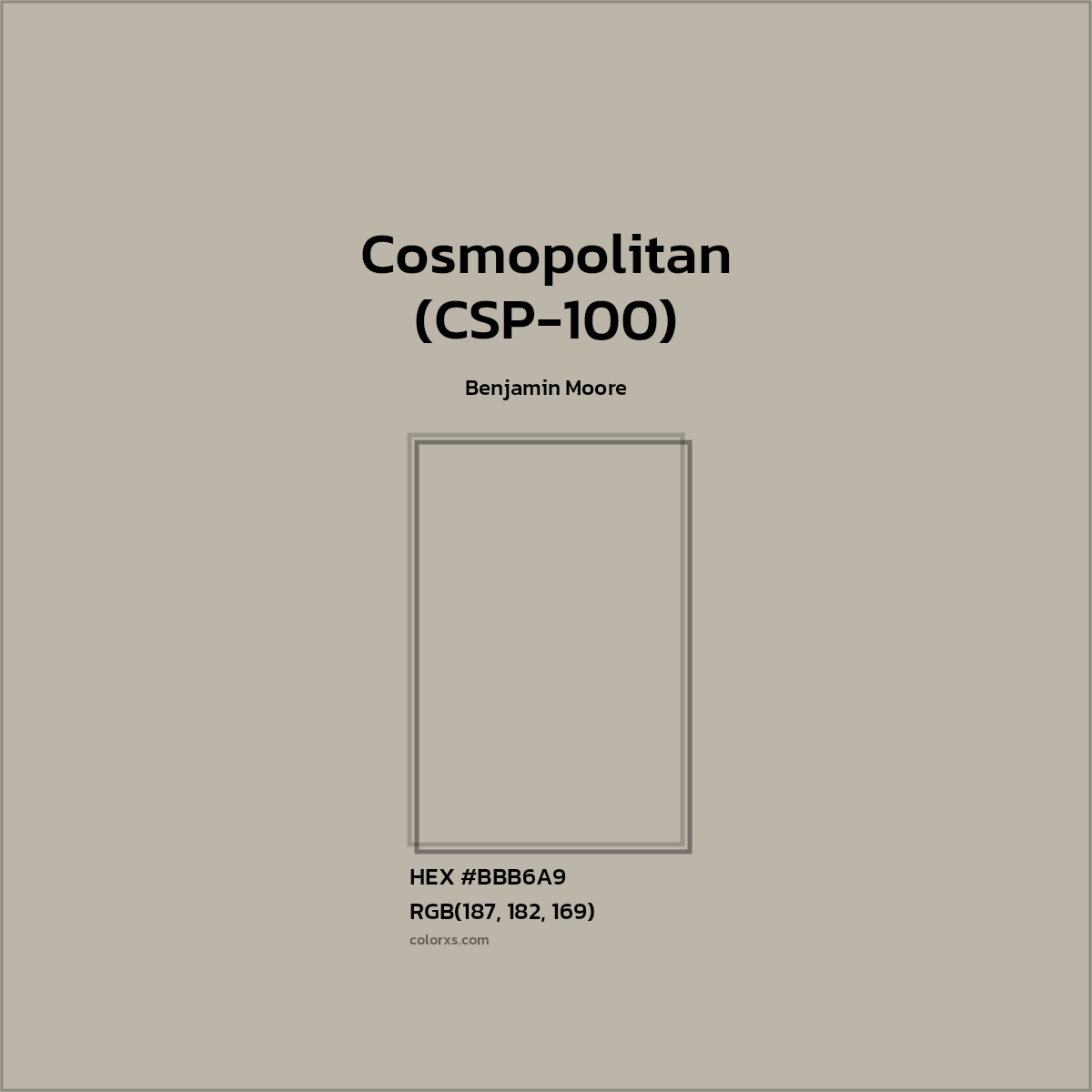 Cosmopolitan (CSP-100) color belongs to the Gray color family (hue). The hexadecimal color code(color number) for Cosmopolitan (CSP-100) is #BBB6A9, and the RGB color code is RGB(187, 182, 169).
