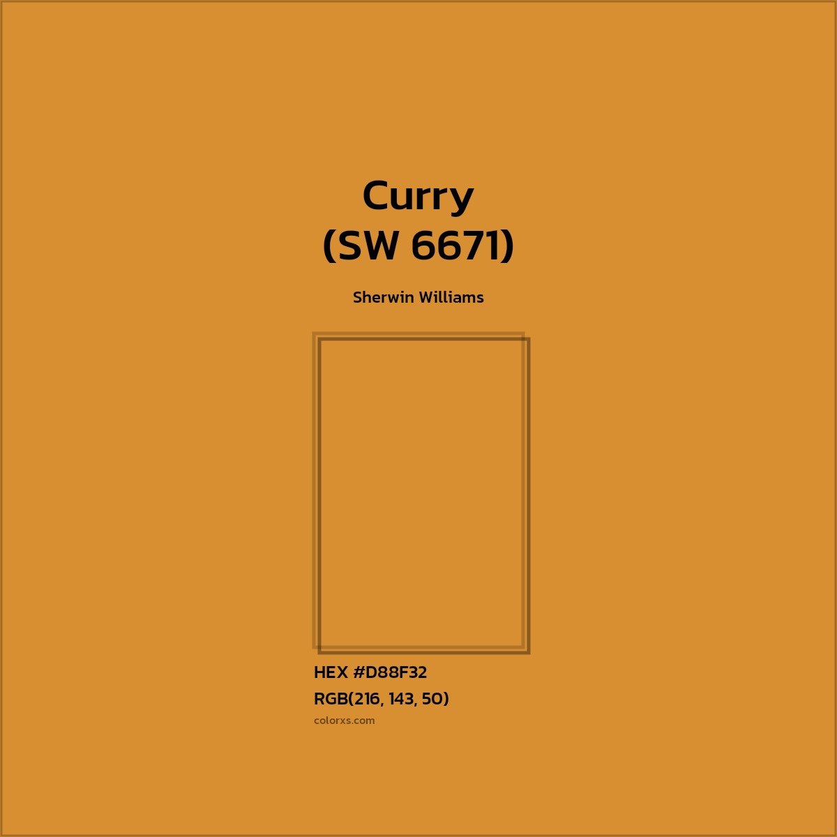 Curry (SW 6671) color belongs to the Yellow color family (hue). The hexadecimal color code(color number) for Curry (SW 6671) is #D88F32, and the RGB color code is RGB(216, 143, 50).