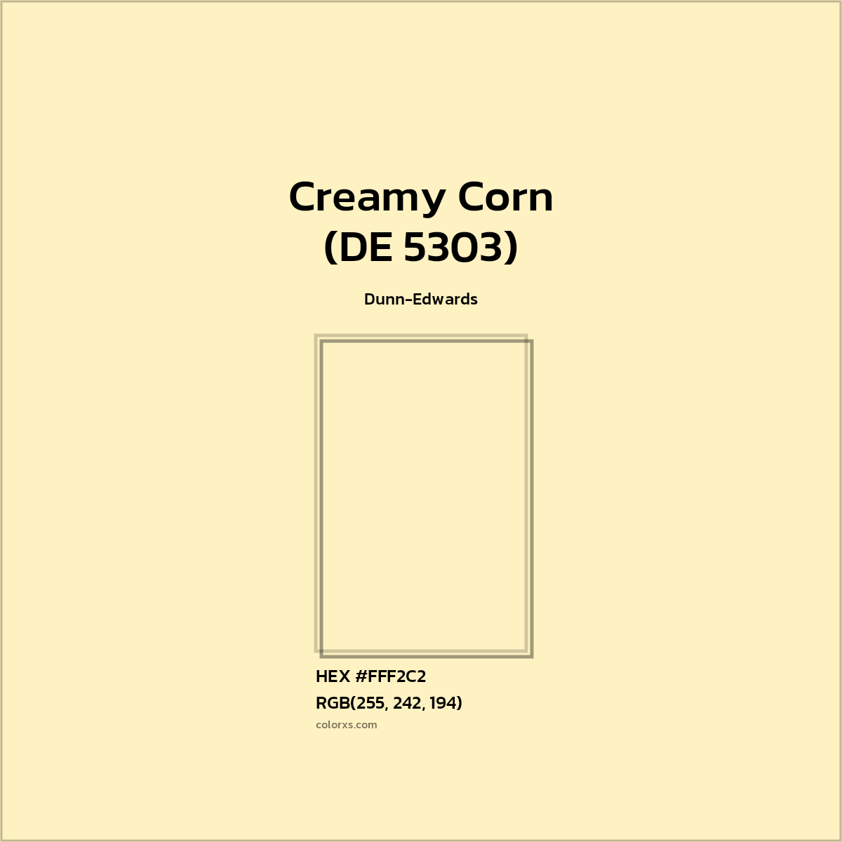 Creamy Corn (DE 5303) color belongs to the Orange color family (hue). The hexadecimal color code(color number) for Creamy Corn (DE 5303) is #FFF2C2, and the RGB color code is RGB(255, 242, 194).