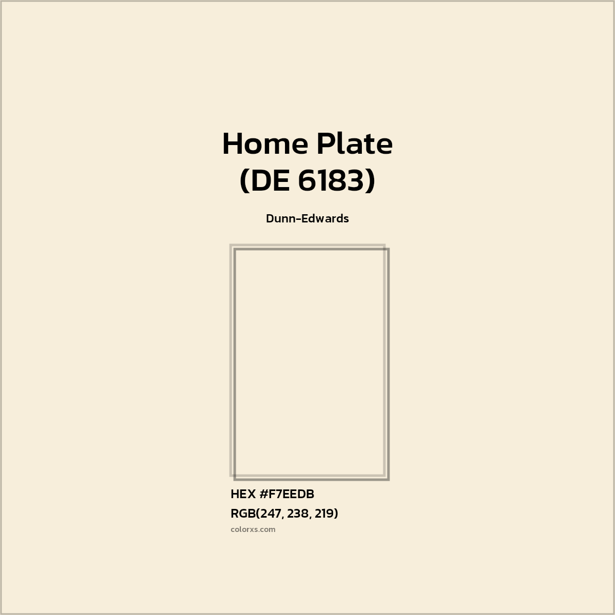 Home Plate (DE 6183) color belongs to the Neutral color family (hue). The hexadecimal color code(color number) for Home Plate (DE 6183) is #F7EEDB, and the RGB color code is RGB(247, 238, 219).