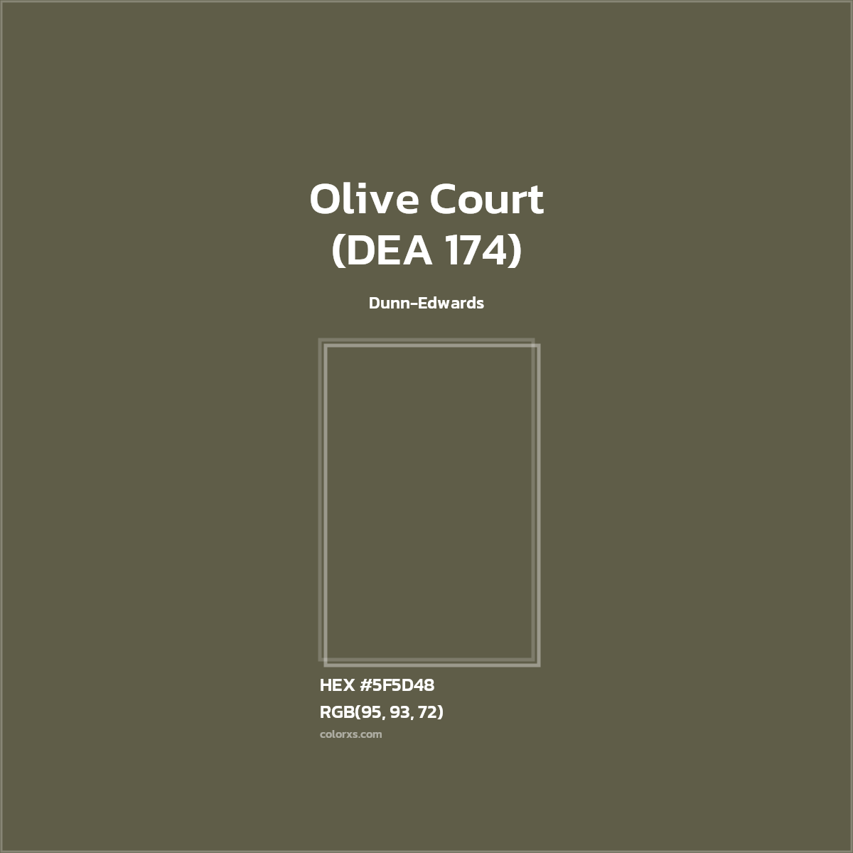 Olive Court (DEA 174) color belongs to the Green color family (hue). The hexadecimal color code(color number) for Olive Court (DEA 174) is #5F5D48, and the RGB color code is RGB(95, 93, 72).