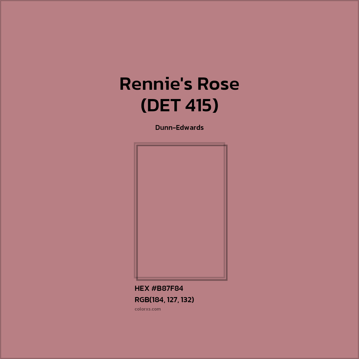 Rennie's Rose (DET 415) color belongs to the Pink color family (hue). The hexadecimal color code(color number) for Rennie's Rose (DET 415) is #B87F84, and the RGB color code is RGB(184, 127, 132).