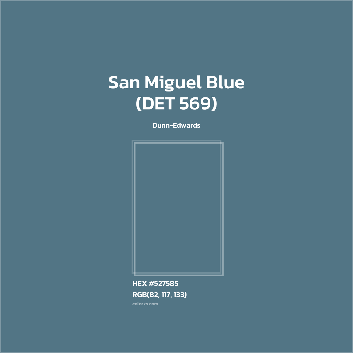 San Miguel Blue (DET 569) color belongs to the Blue color family (hue). The hexadecimal color code(color number) for San Miguel Blue (DET 569) is #527585, and the RGB color code is RGB(82, 117, 133).
