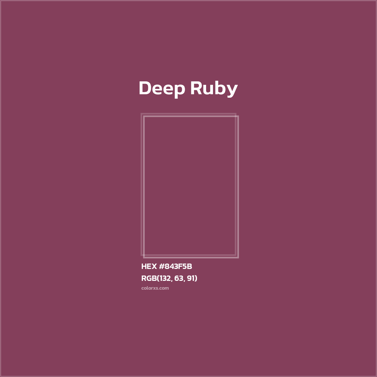 Deep Ruby color belongs to the Purple color family (hue). The hexadecimal color code(color number) for Deep Ruby is #843F5B, and the RGB color code is RGB(132, 63, 91).