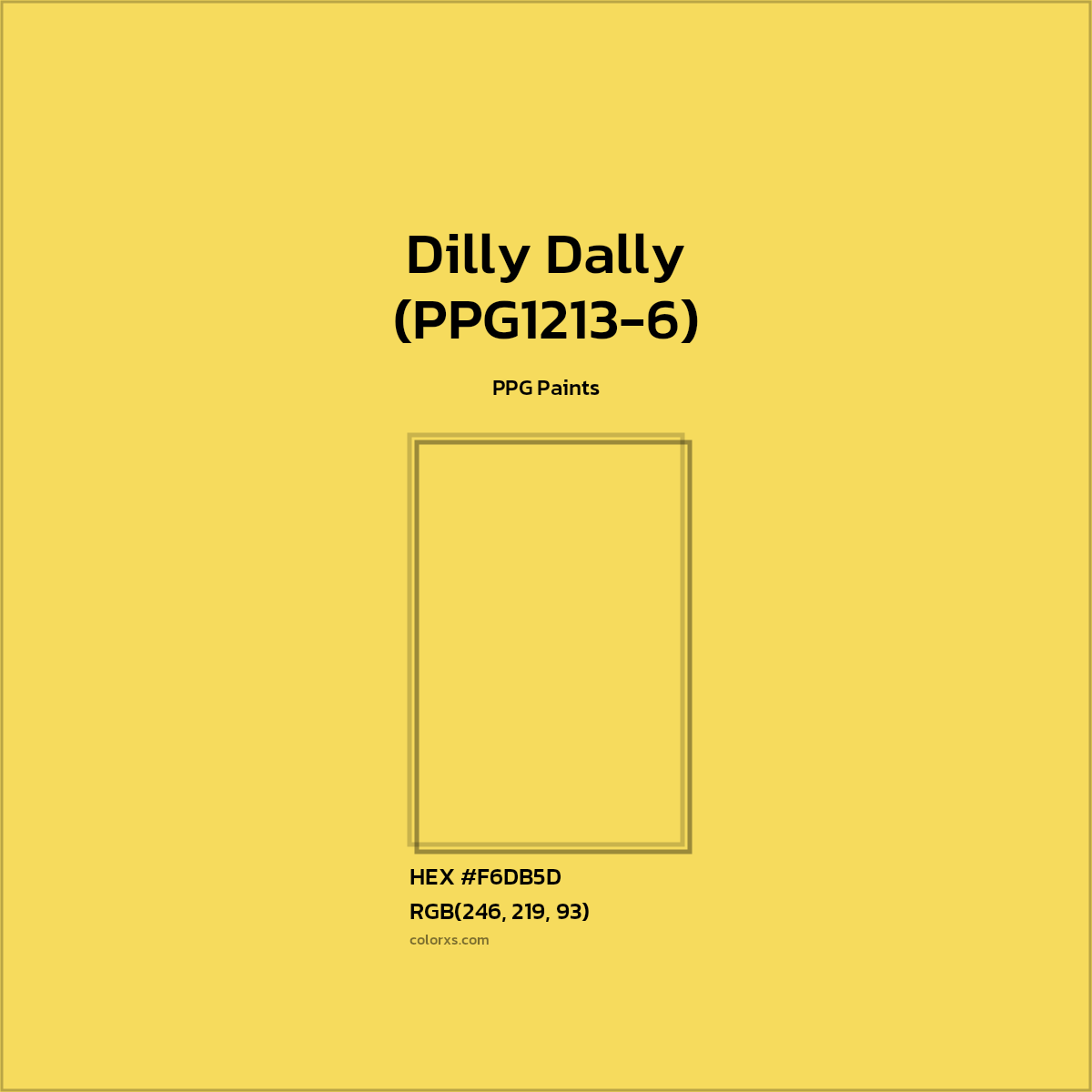 Dilly Dally (PPG1213-6) color belongs to the Yellow color family (hue). The hexadecimal color code(color number) for Dilly Dally (PPG1213-6) is #F6DB5D, and the RGB color code is RGB(246, 219, 93).
