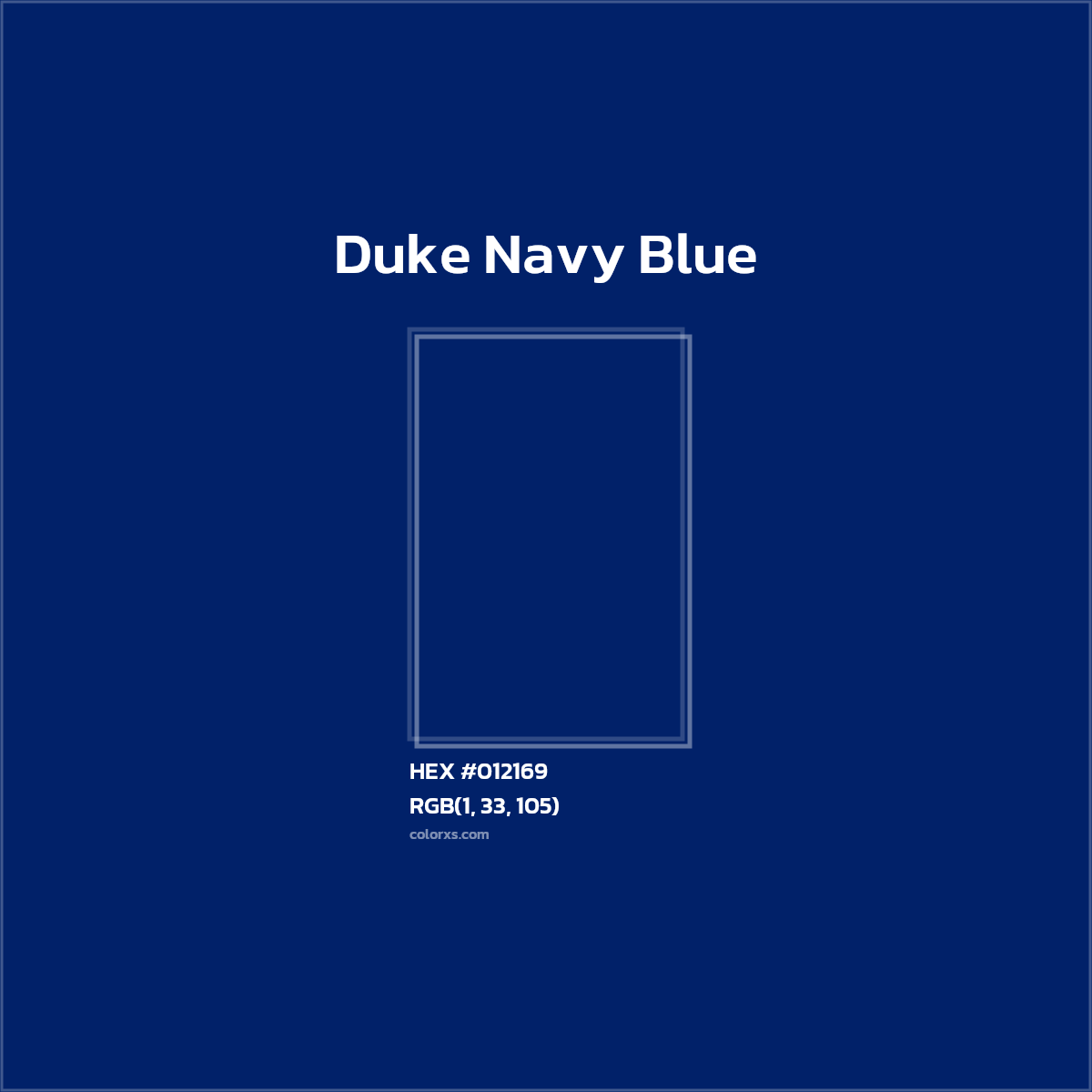 Duke Navy Blue color belongs to the Blue color family (hue). The hexadecimal color code(color number) for Duke Navy Blue is #012169, and the RGB color code is RGB(1, 33, 105).