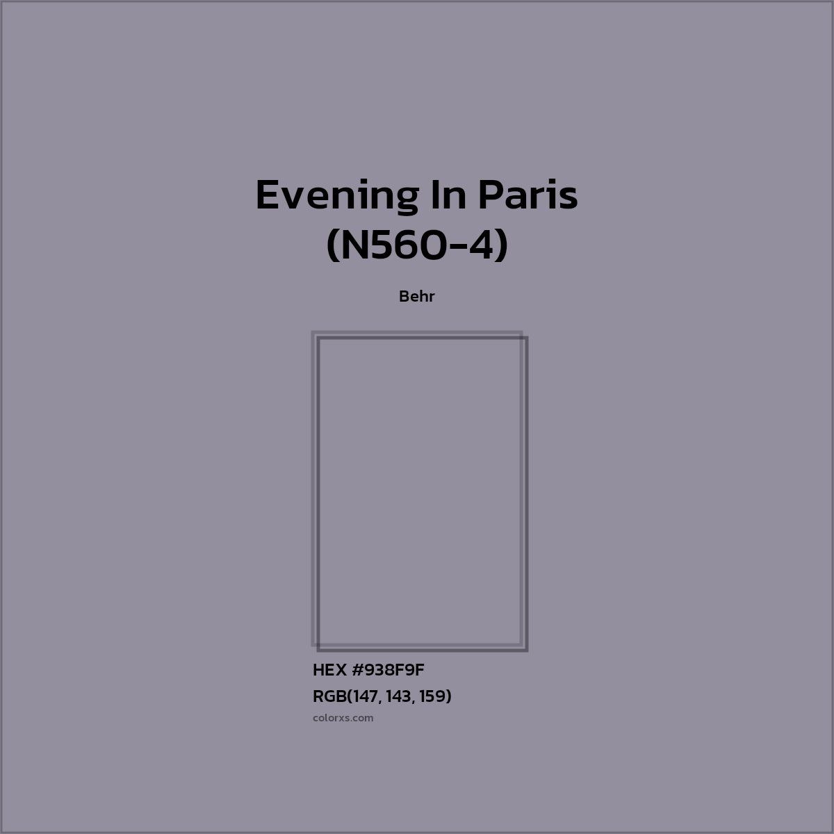 Evening In Paris (N560-4) color belongs to the Gray color family (hue). The hexadecimal color code(color number) for Evening In Paris (N560-4) is #938F9F, and the RGB color code is RGB(147, 143, 159).
