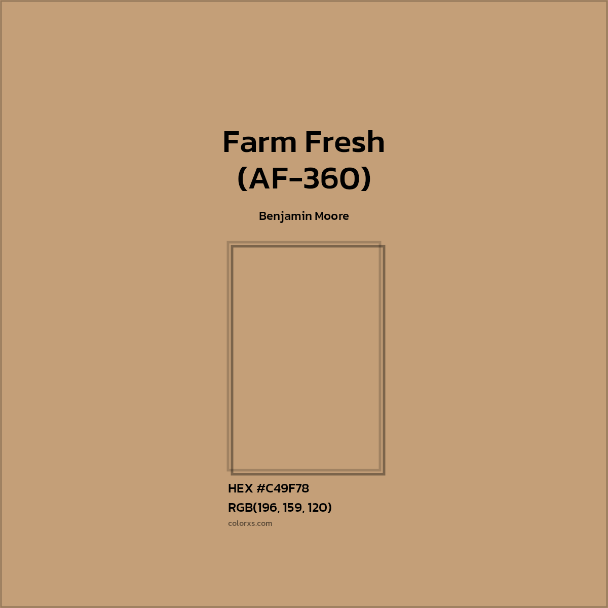 Farm Fresh (AF-360) color belongs to the Orange color family (hue). The hexadecimal color code(color number) for Farm Fresh (AF-360) is #C49F78, and the RGB color code is RGB(196, 159, 120).