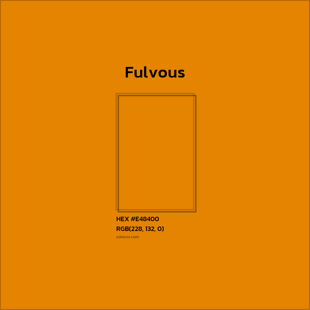 Fulvous color belongs to the Orange color family (hue). The hexadecimal color code(color number) for Fulvous is #E48400, and the RGB color code is RGB(228, 132, 0).