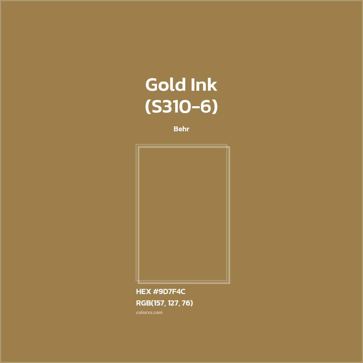 Gold Ink (S310-6) color belongs to the Yellow color family (hue). The hexadecimal color code(color number) for Gold Ink (S310-6) is #9D7F4C, and the RGB color code is RGB(157, 127, 76).
