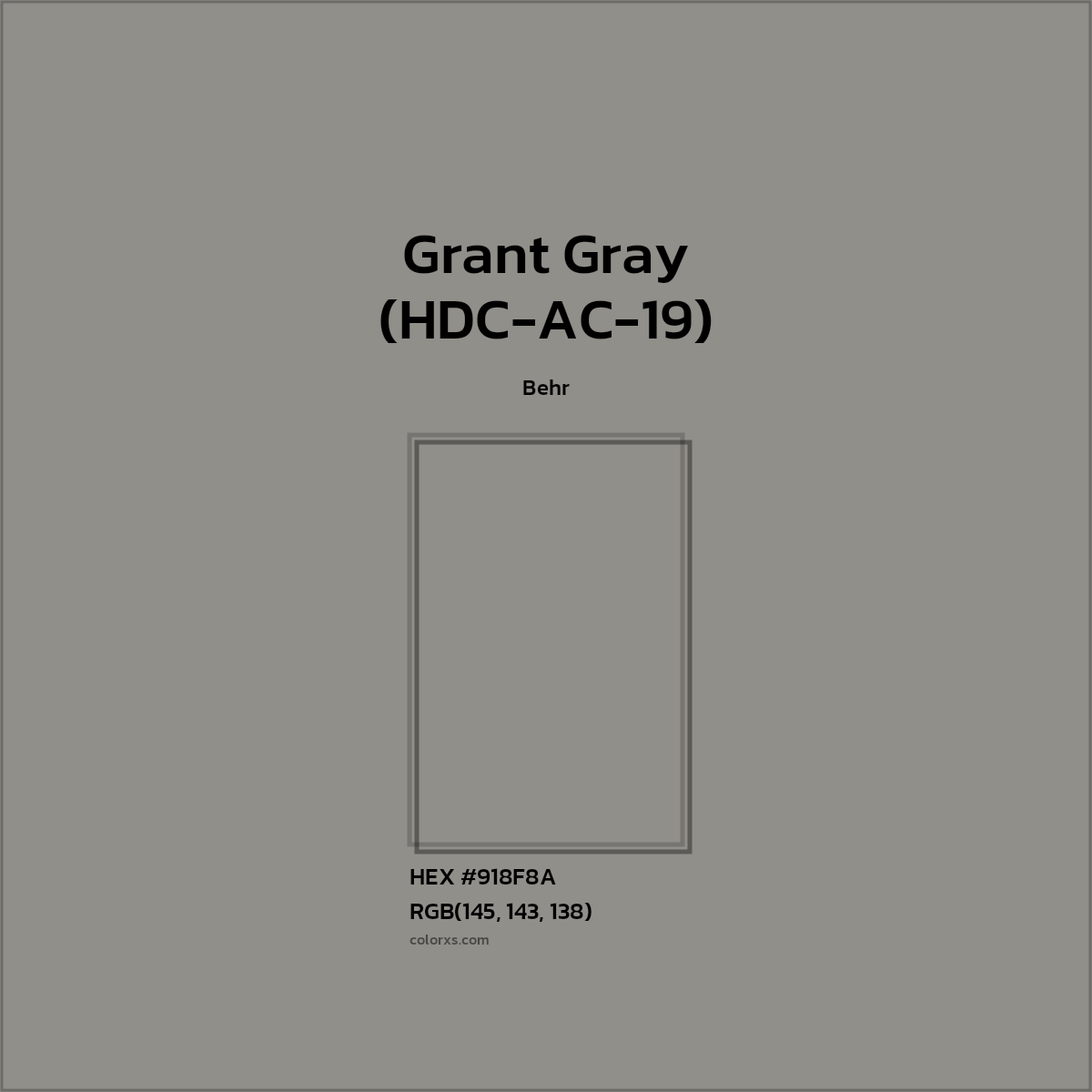 Grant Gray (HDC-AC-19) color belongs to the Gray color family (hue). The hexadecimal color code(color number) for Grant Gray (HDC-AC-19) is #918F8A, and the RGB color code is RGB(145, 143, 138).