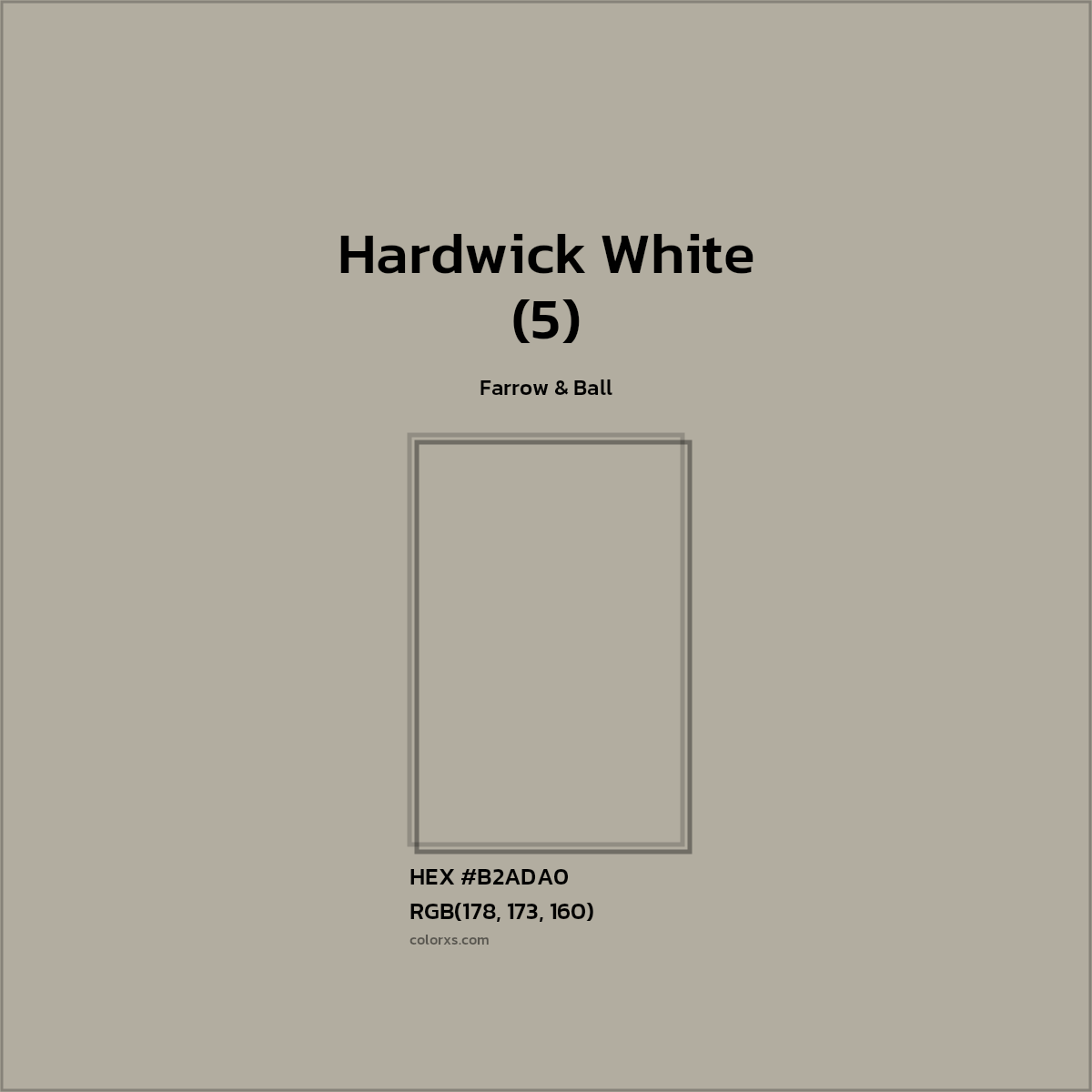Hardwick White (5) color belongs to the Gray Gray Green color family (hue). The hexadecimal color code(color number) for Hardwick White (5) is #B2ADA0, and the RGB color code is RGB(178, 173, 160).