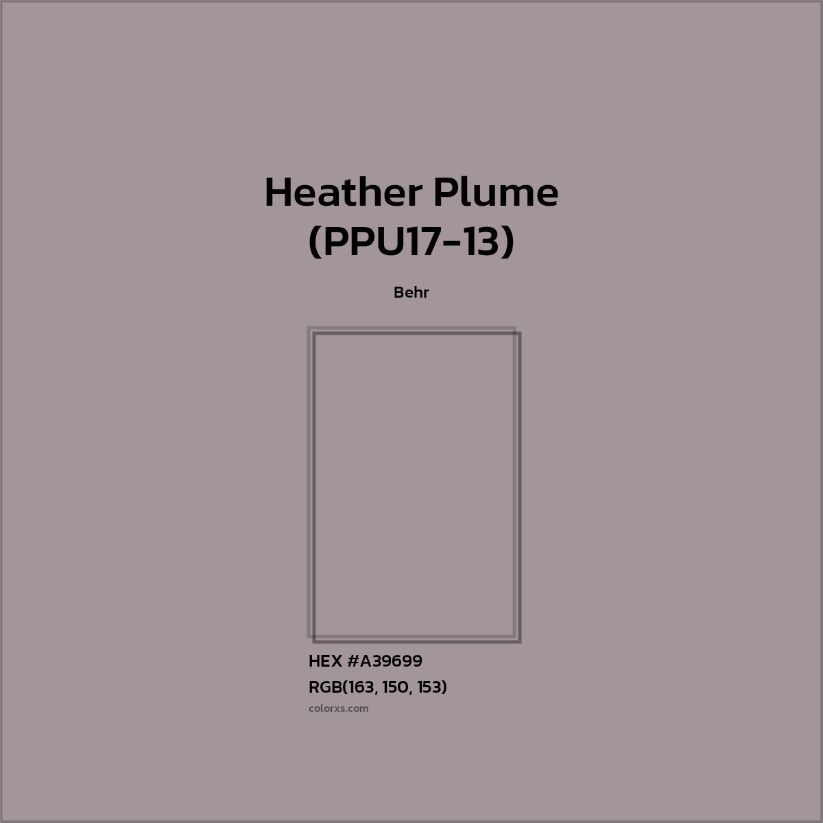 Heather Plume (PPU17-13) color belongs to the Neutral color family (hue). The hexadecimal color code(color number) for Heather Plume (PPU17-13) is #A39699, and the RGB color code is RGB(163, 150, 153).
