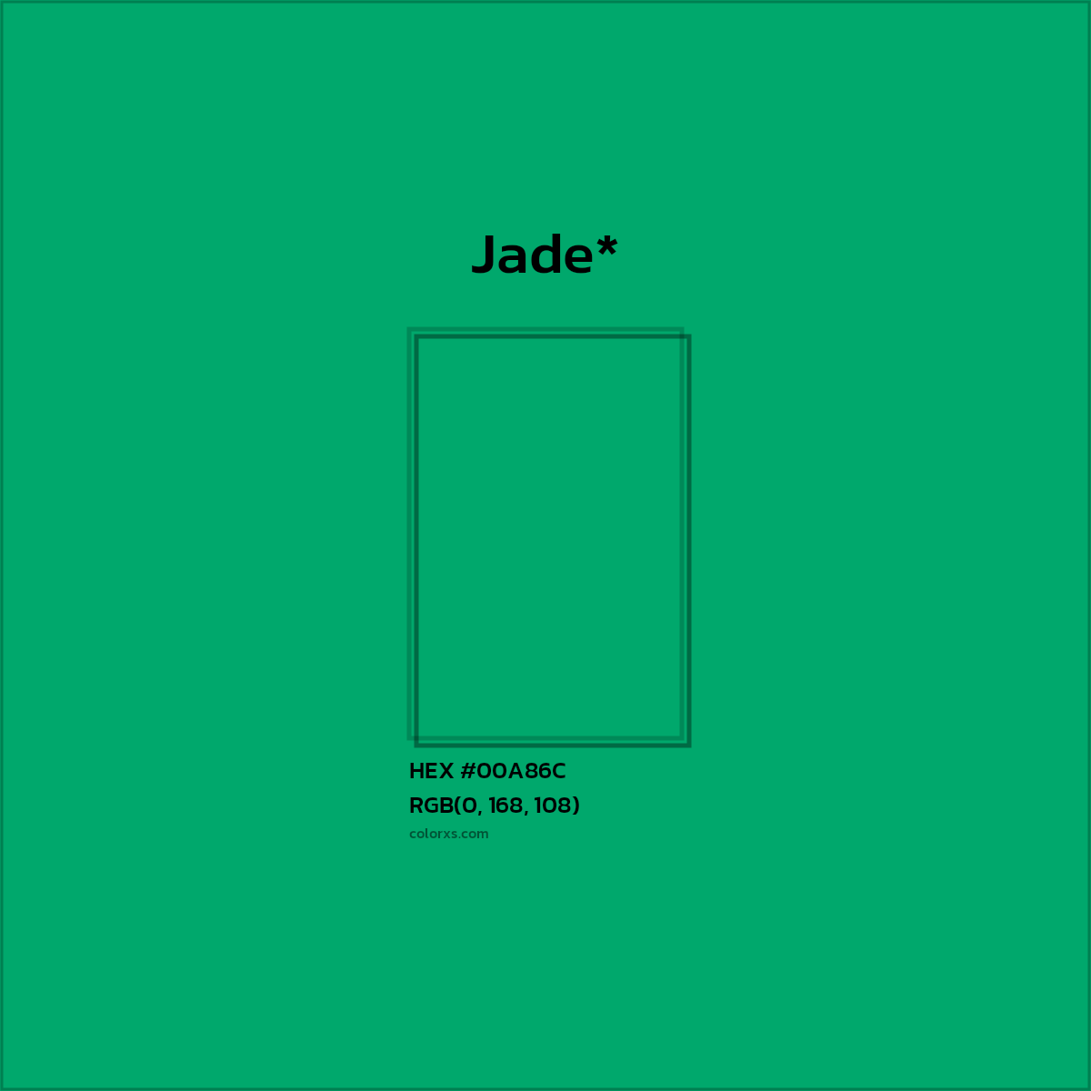 The RGB color code for color number #00A86C is RGB(0, 168, 108). In the RGB color model, #00A86C has a red value of 0, a green value of 168, and a blue value of 108. The CMYK color model (also known as process color, used in color printing) comprises 100.0% cyan, 0.0% magenta, 35.7% yellow, and 34.1% key (black). The HSL color scale has a hue of 158.6° (degrees), 100.0 % saturation, and 32.9 % lightness. In the HSB/HSV color space, #00A86C has a hue of 158.6° (degrees), 100.0 % saturation and 65.9 % brightness/value.