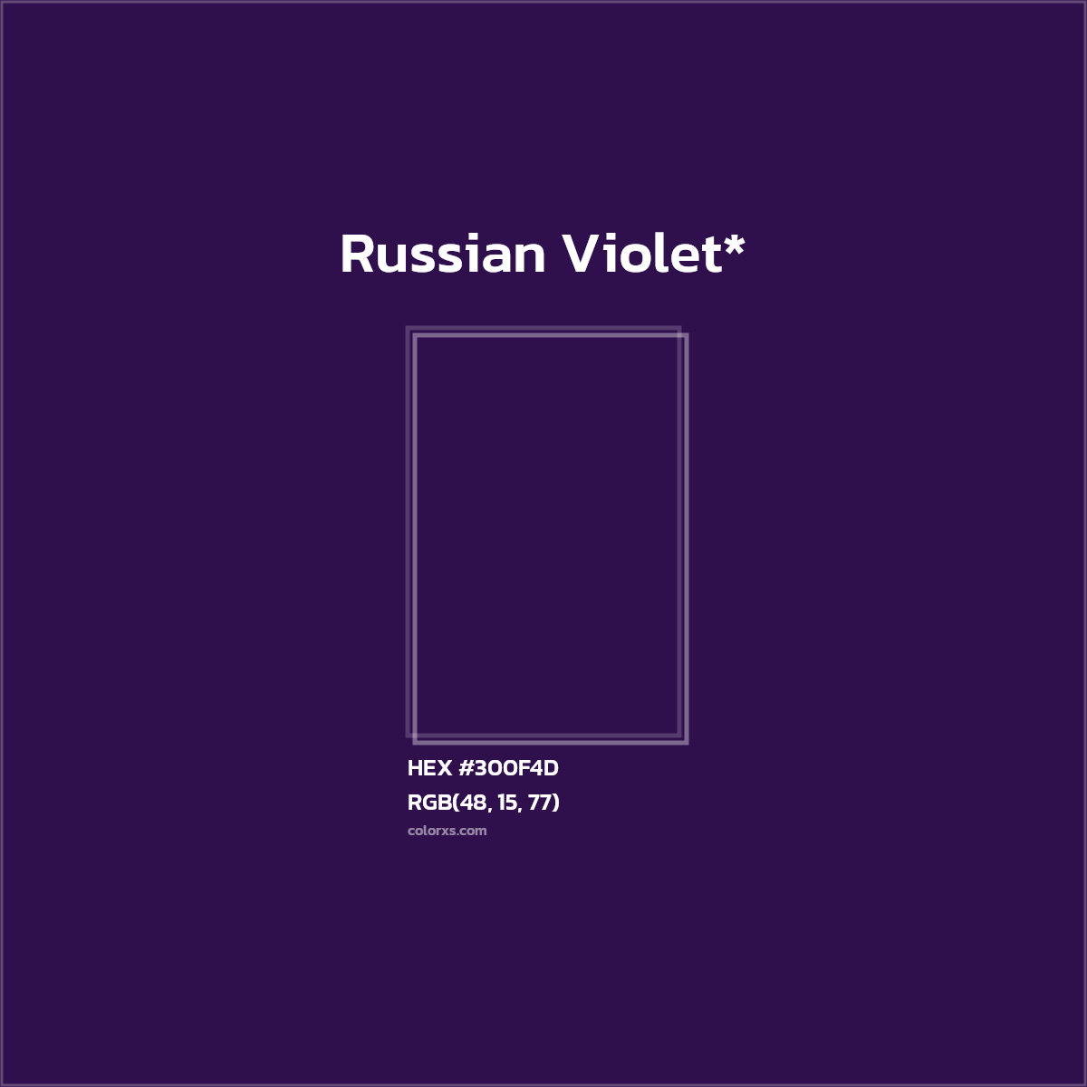 The RGB color code for color number #300F4D is RGB(48, 15, 77). In the RGB color model, #300F4D has a red value of 48, a green value of 15, and a blue value of 77. The CMYK color model (also known as process color, used in color printing) comprises 37.7% cyan, 80.5% magenta, 0.0% yellow, and 69.8% key (black). The HSL color scale has a hue of 271.9° (degrees), 67.4 % saturation, and 18.0 % lightness. In the HSB/HSV color space, #300F4D has a hue of 271.9° (degrees), 80.5 % saturation and 30.2 % brightness/value.