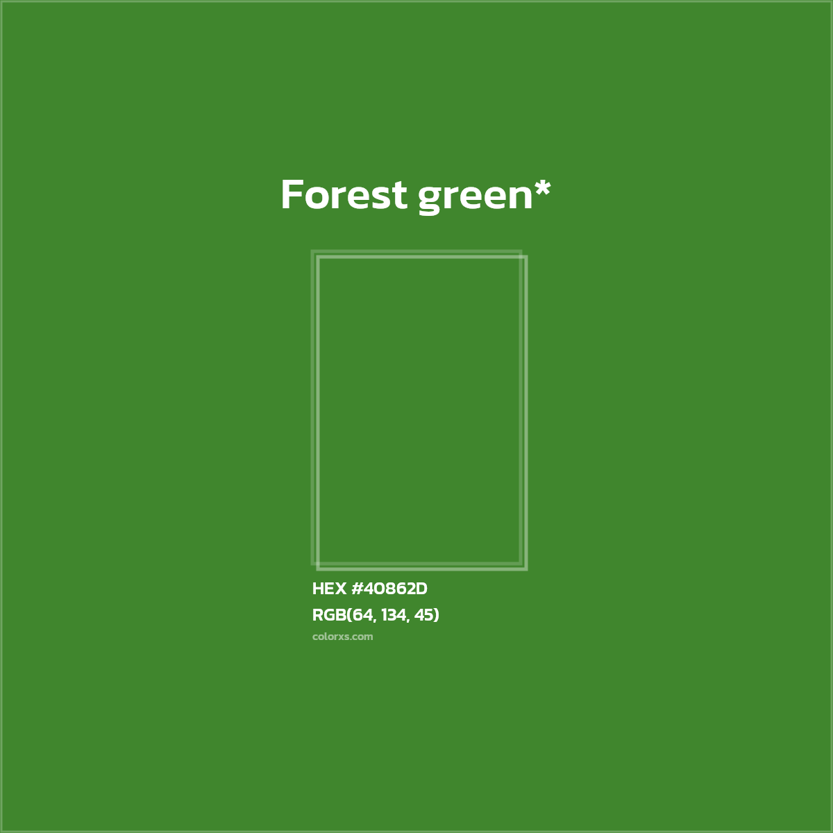 The RGB color code for color number #40862D is RGB(64, 134, 45). In the RGB color model, #40862D has a red value of 64, a green value of 134, and a blue value of 45. The CMYK color model (also known as process color, used in color printing) comprises 52.2% cyan, 0.0% magenta, 66.4% yellow, and 47.5% key (black). The HSL color scale has a hue of 107.2° (degrees), 49.7 % saturation, and 35.1 % lightness. In the HSB/HSV color space, #40862D has a hue of 107.2° (degrees), 66.4 % saturation and 52.5 % brightness/value.