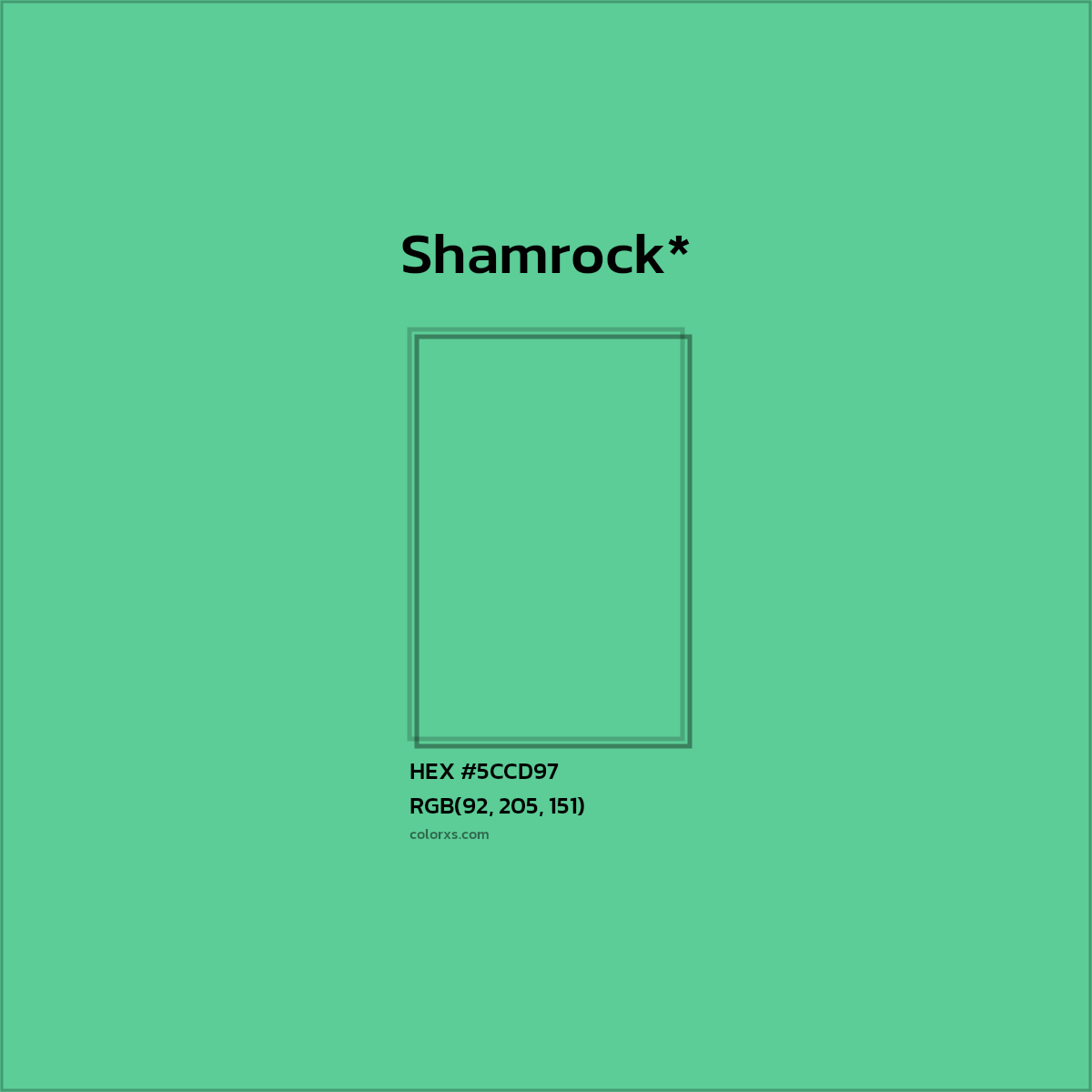 The RGB color code for color number #5CCD97 is RGB(92, 205, 151). In the RGB color model, #5CCD97 has a red value of 92, a green value of 205, and a blue value of 151. The CMYK color model (also known as process color, used in color printing) comprises 55.1% cyan, 0.0% magenta, 26.3% yellow, and 19.6% key (black). The HSL color scale has a hue of 151.3° (degrees), 53.1 % saturation, and 58.2 % lightness. In the HSB/HSV color space, #5CCD97 has a hue of 151.3° (degrees), 55.1 % saturation and 80.4 % brightness/value.