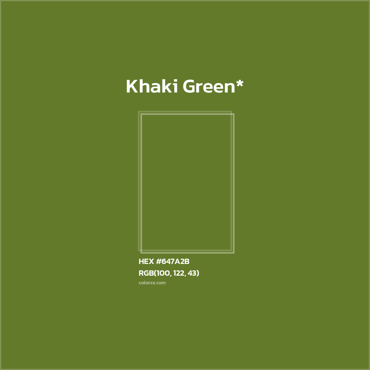 The RGB color code for color number #647A2B is RGB(100, 122, 43). In the RGB color model, #647A2B has a red value of 100, a green value of 122, and a blue value of 43. The CMYK color model (also known as process color, used in color printing) comprises 18.0% cyan, 0.0% magenta, 64.8% yellow, and 52.2% key (black). The HSL color scale has a hue of 76.7° (degrees), 47.9 % saturation, and 32.4 % lightness. In the HSB/HSV color space, #647A2B has a hue of 76.7° (degrees), 64.8 % saturation and 47.8 % brightness/value.