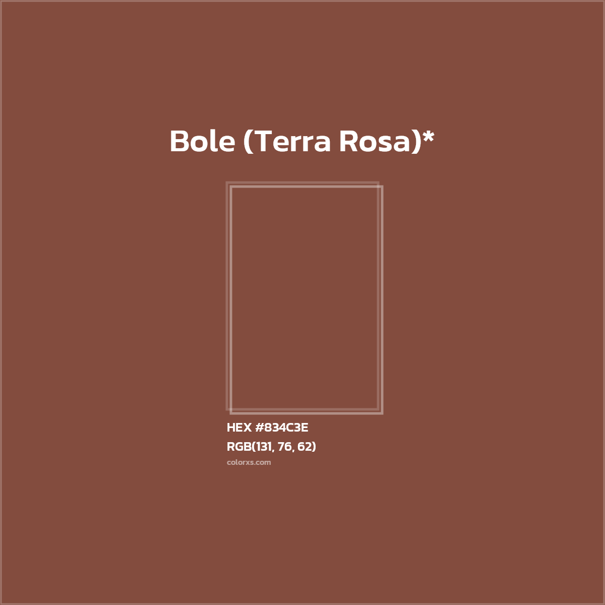 The RGB color code for color number #834C3E is RGB(131, 76, 62). In the RGB color model, #834C3E has a red value of 131, a green value of 76, and a blue value of 62. The CMYK color model (also known as process color, used in color printing) comprises 0.0% cyan, 42.0% magenta, 52.7% yellow, and 48.6% key (black). The HSL color scale has a hue of 12.2° (degrees), 35.8 % saturation, and 37.8 % lightness. In the HSB/HSV color space, #834C3E has a hue of 12.2° (degrees), 52.7 % saturation and 51.4 % brightness/value.