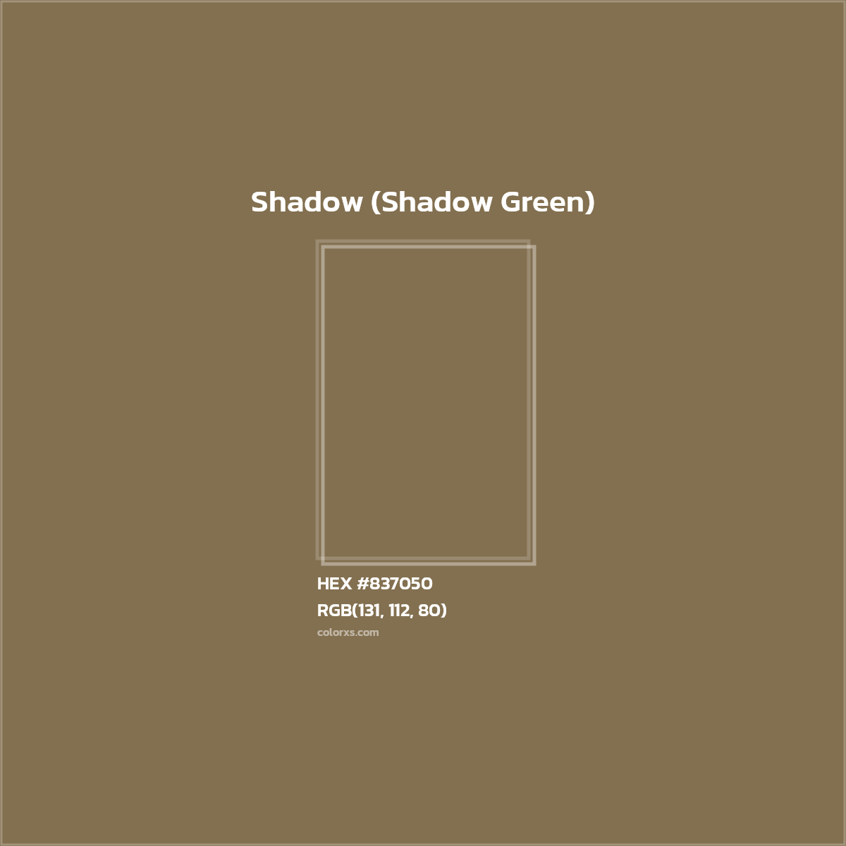 The color name for #837050 is Shadow (Shadow Green) and is belongs to the Green color family (hue). The RGB color code for color number #837050 is RGB(131, 112, 80). In the RGB color model, #837050 has a red value of 131, a green value of 112, and a blue value of 80. The CMYK color model (also known as process color, used in color printing) comprises 0.0% cyan, 14.5% magenta, 38.9% yellow, and 48.6% key (black). The HSL color scale has a hue of 37.6° (degrees), 24.2 % saturation, and 41.4 % lightness. In the HSB/HSV color space, #837050 has a hue of 37.6° (degrees), 38.9 % saturation and 51.4 % brightness/value.