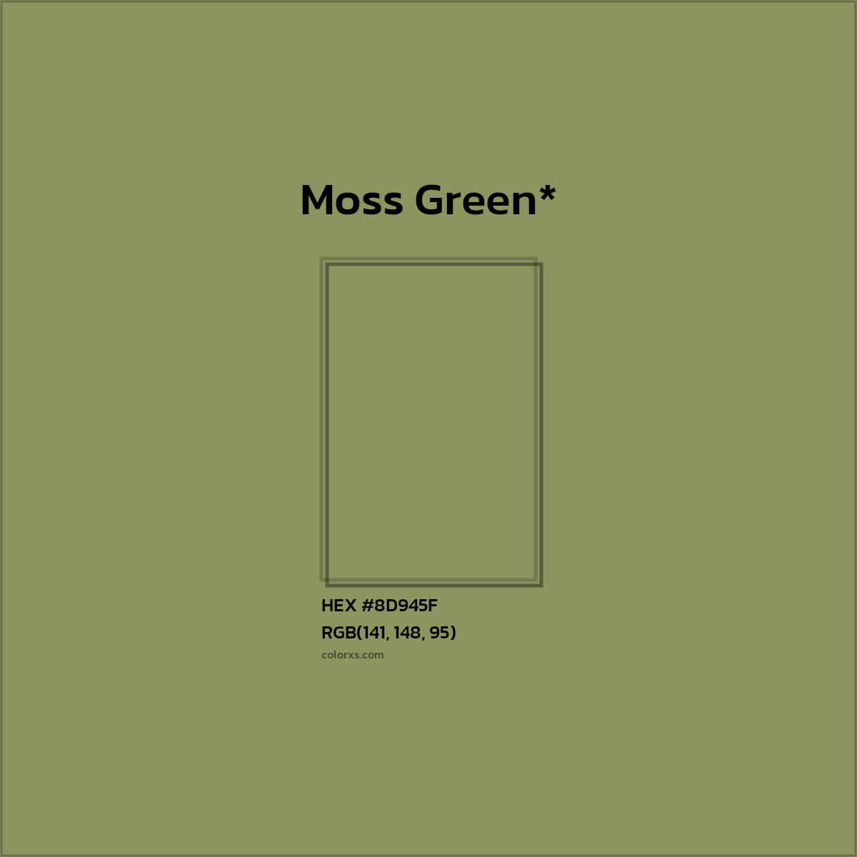 The RGB color code for color number #8D945F is RGB(141, 148, 95). In the RGB color model, #8D945F has a red value of 141, a green value of 148, and a blue value of 95. The CMYK color model (also known as process color, used in color printing) comprises 4.7% cyan, 0.0% magenta, 35.8% yellow, and 42.0% key (black). The HSL color scale has a hue of 67.9° (degrees), 21.8 % saturation, and 47.6 % lightness. In the HSB/HSV color space, #8D945F has a hue of 67.9° (degrees), 35.8 % saturation and 58.0 % brightness/value.