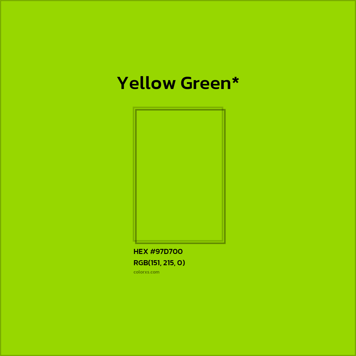 The RGB color code for color number #97D700 is RGB(151, 215, 0). In the RGB color model, #97D700 has a red value of 151, a green value of 215, and a blue value of 0. The CMYK color model (also known as process color, used in color printing) comprises 29.8% cyan, 0.0% magenta, 100.0% yellow, and 15.7% key (black). The HSL color scale has a hue of 77.9° (degrees), 100.0 % saturation, and 42.2 % lightness. In the HSB/HSV color space, #97D700 has a hue of 77.9° (degrees), 100.0 % saturation and 84.3 % brightness/value.