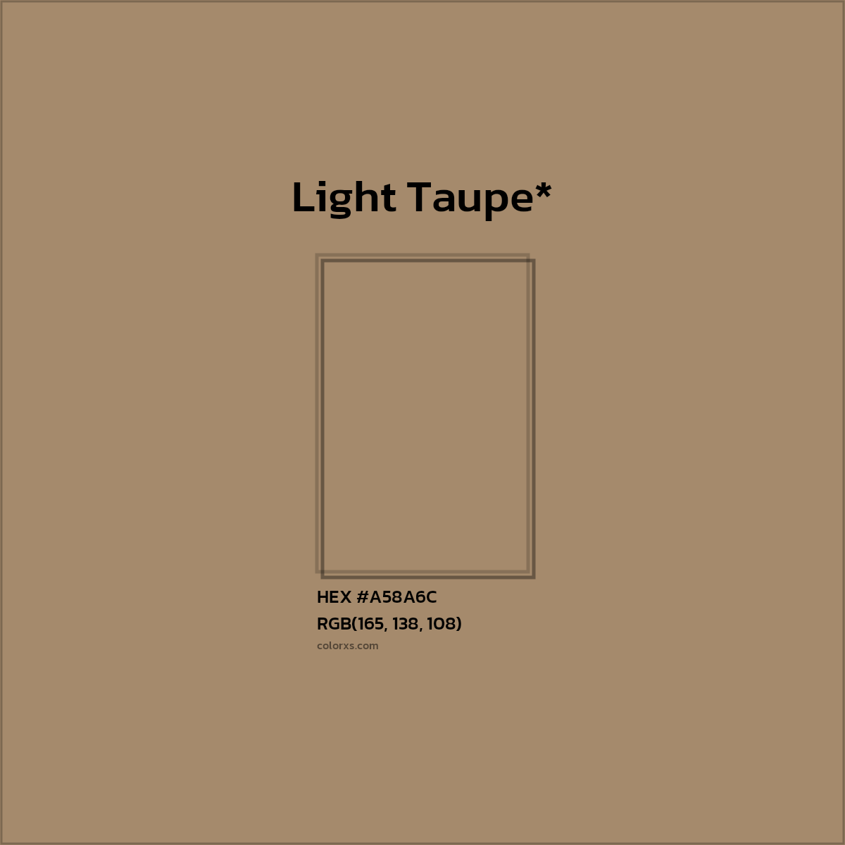 The RGB color code for color number #A58A6C is RGB(165, 138, 108). In the RGB color model, #A58A6C has a red value of 165, a green value of 138, and a blue value of 108. The CMYK color model (also known as process color, used in color printing) comprises 0.0% cyan, 16.4% magenta, 34.5% yellow, and 35.3% key (black). The HSL color scale has a hue of 31.6° (degrees), 24.1 % saturation, and 53.5 % lightness. In the HSB/HSV color space, #A58A6C has a hue of 31.6° (degrees), 34.5 % saturation and 64.7 % brightness/value.