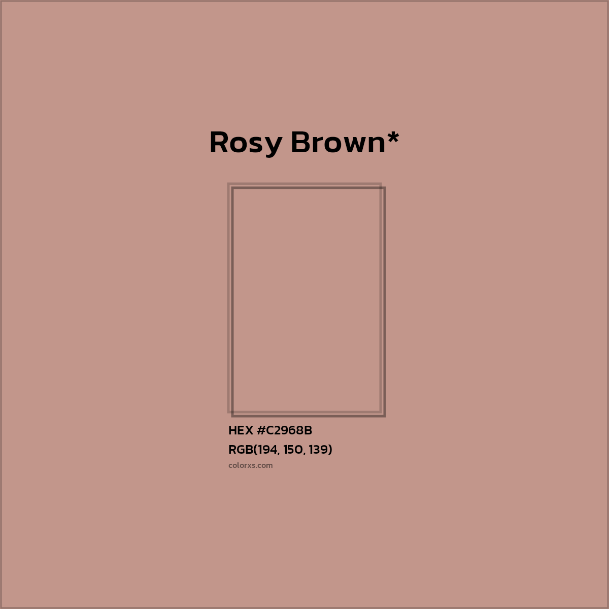 The RGB color code for color number #C2968B is RGB(194, 150, 139). In the RGB color model, #C2968B has a red value of 194, a green value of 150, and a blue value of 139. The CMYK color model (also known as process color, used in color printing) comprises 0.0% cyan, 22.7% magenta, 28.4% yellow, and 23.9% key (black). The HSL color scale has a hue of 12° (degrees), 31.1 % saturation, and 65.3 % lightness. In the HSB/HSV color space, #C2968B has a hue of 12° (degrees), 28.4 % saturation and 76.1 % brightness/value.