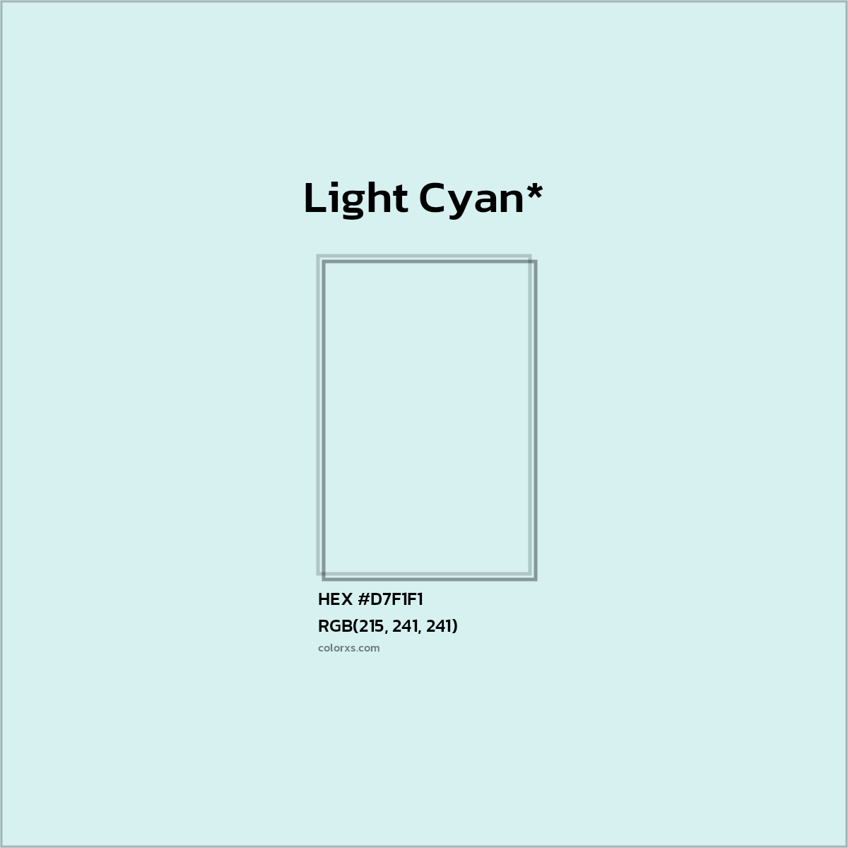 The RGB color code for color number #D7F1F1 is RGB(215, 241, 241). In the RGB color model, #D7F1F1 has a red value of 215, a green value of 241, and a blue value of 241. The CMYK color model (also known as process color, used in color printing) comprises 10.8% cyan, 0.0% magenta, 0.0% yellow, and 5.5% key (black). The HSL color scale has a hue of 180° (degrees), 48.1 % saturation, and 89.4 % lightness. In the HSB/HSV color space, #D7F1F1 has a hue of 180° (degrees), 10.8 % saturation and 94.5 % brightness/value.