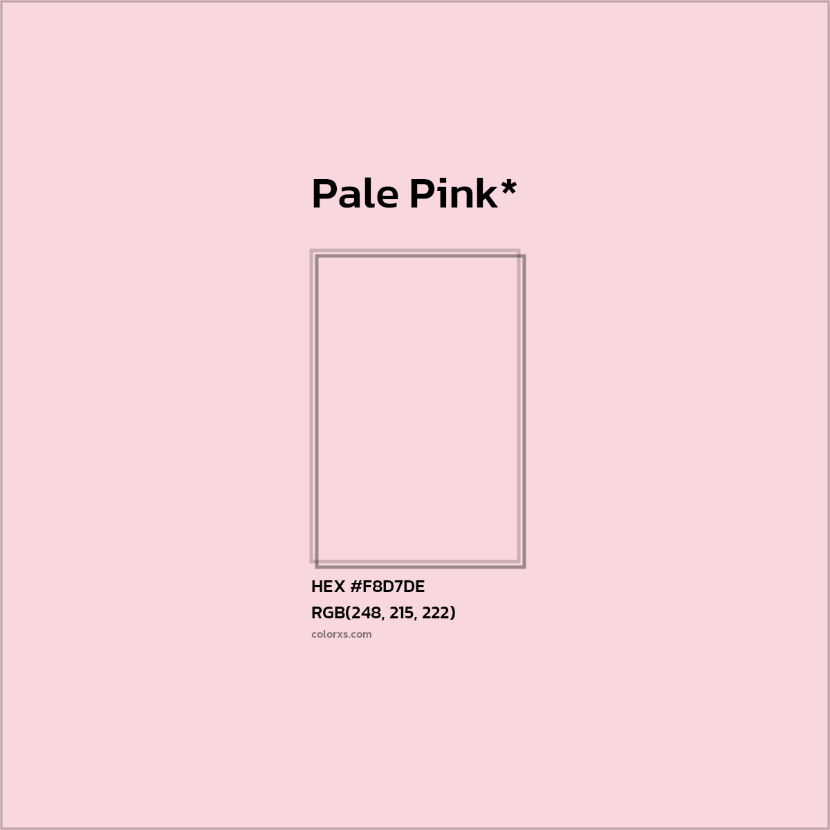 The RGB color code for color number #F8D7DE is RGB(248, 215, 222). In the RGB color model, #F8D7DE has a red value of 248, a green value of 215, and a blue value of 222. The CMYK color model (also known as process color, used in color printing) comprises 0.0% cyan, 13.3% magenta, 10.5% yellow, and 2.7% key (black). The HSL color scale has a hue of 347.3° (degrees), 70.2 % saturation, and 90.8 % lightness. In the HSB/HSV color space, #F8D7DE has a hue of 347.3° (degrees), 13.3 % saturation and 97.3 % brightness/value.