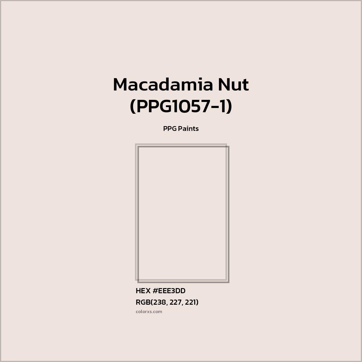 Macadamia Nut (PPG1057-1) color belongs to the Pink color family (hue). The hexadecimal color code(color number) for Macadamia Nut (PPG1057-1) is #EEE3DD, and the RGB color code is RGB(238, 227, 221).