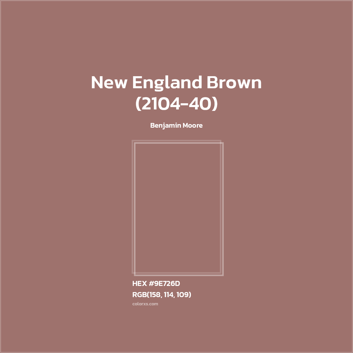 New England Brown (2104-40) color belongs to the Red color family (hue). The hexadecimal color code(color number) for New England Brown (2104-40) is #9E726D, and the RGB color code is RGB(158, 114, 109).