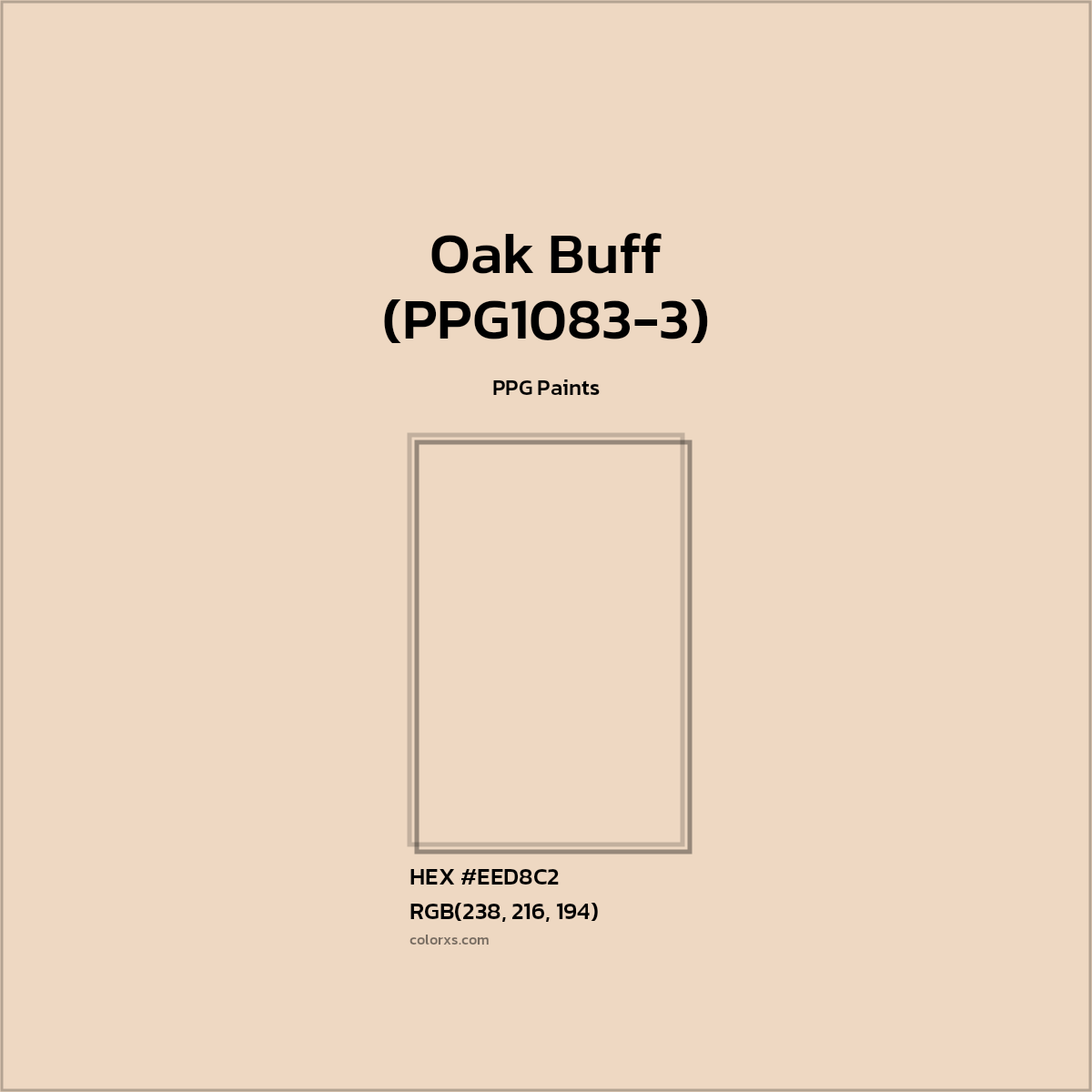 Oak Buff (PPG1083-3) color belongs to the Orange color family (hue). The hexadecimal color code(color number) for Oak Buff (PPG1083-3) is #EED8C2, and the RGB color code is RGB(238, 216, 194).