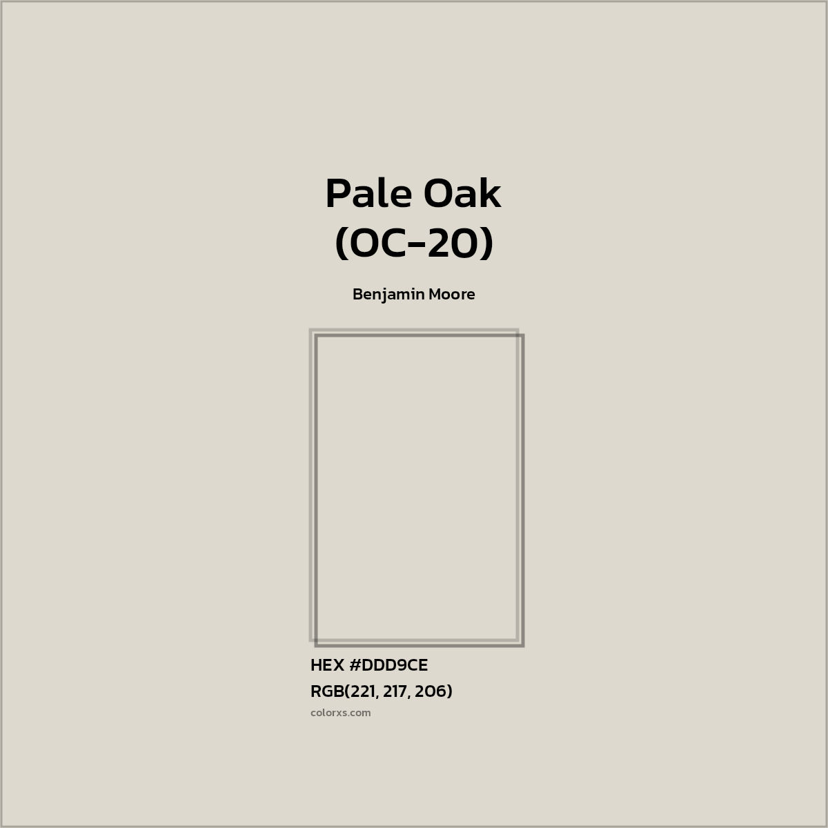 Pale Oak (OC-20) color belongs to the White color family (hue). The hexadecimal color code(color number) for Pale Oak (OC-20) is #DDD9CE, and the RGB color code is RGB(221, 217, 206).