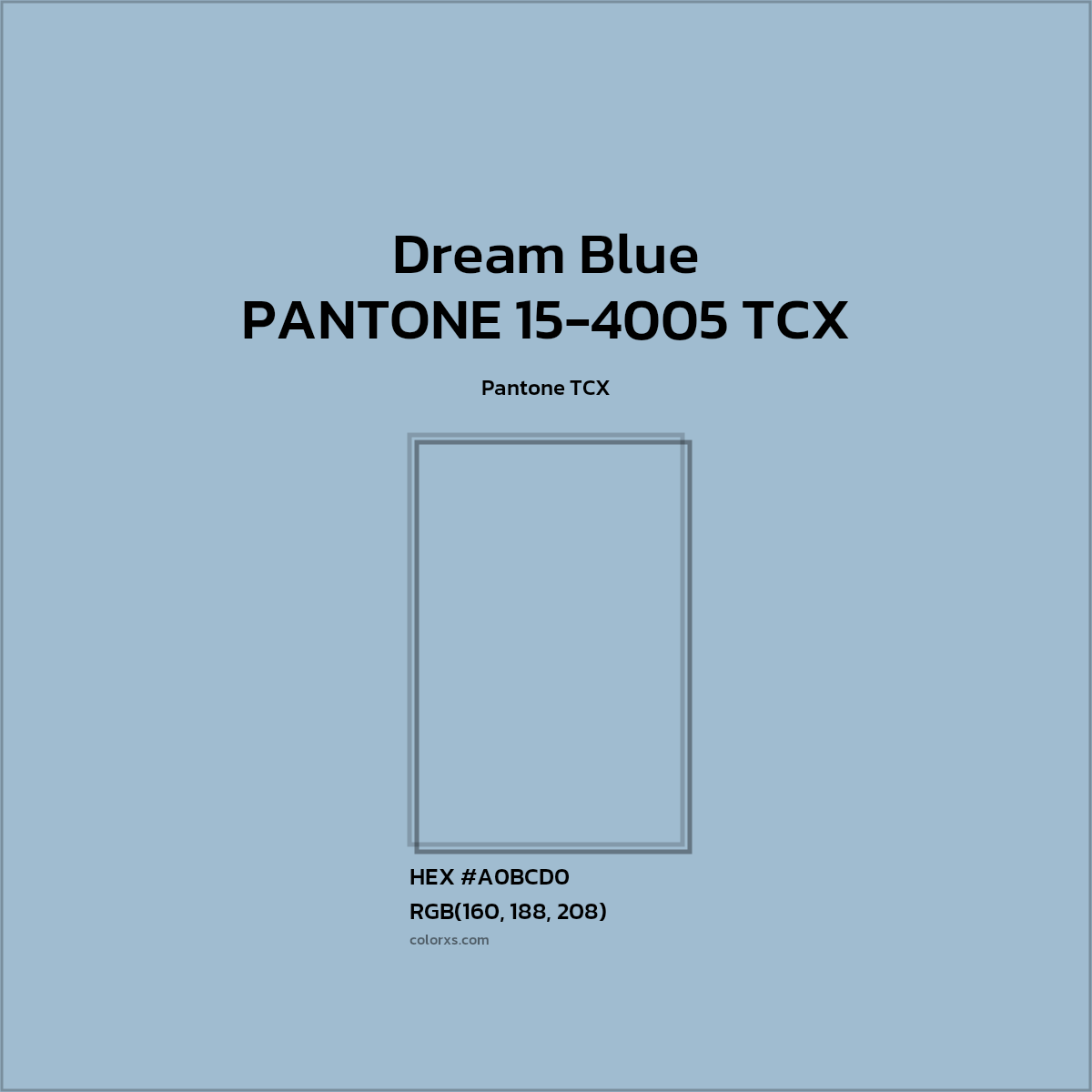 PANTONE 15-4005 TCX - Dream Blue color belongs to the Blue color family (hue). The hexadecimal color code(color number) for PANTONE 15-4005 TCX - Dream Blue is #A0BCD0, and the RGB color code is RGB(160, 188, 208).