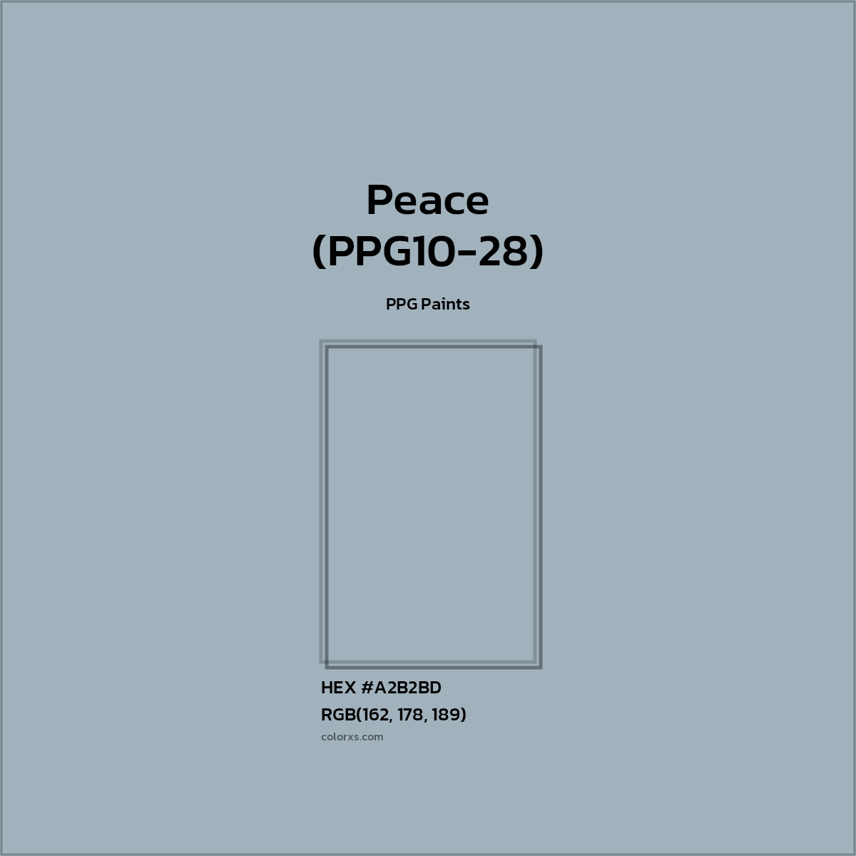 Peace (PPG10-28) color belongs to the Neutral color family (hue). The hexadecimal color code(color number) for Peace (PPG10-28) is #A2B2BD, and the RGB color code is RGB(162, 178, 189).
