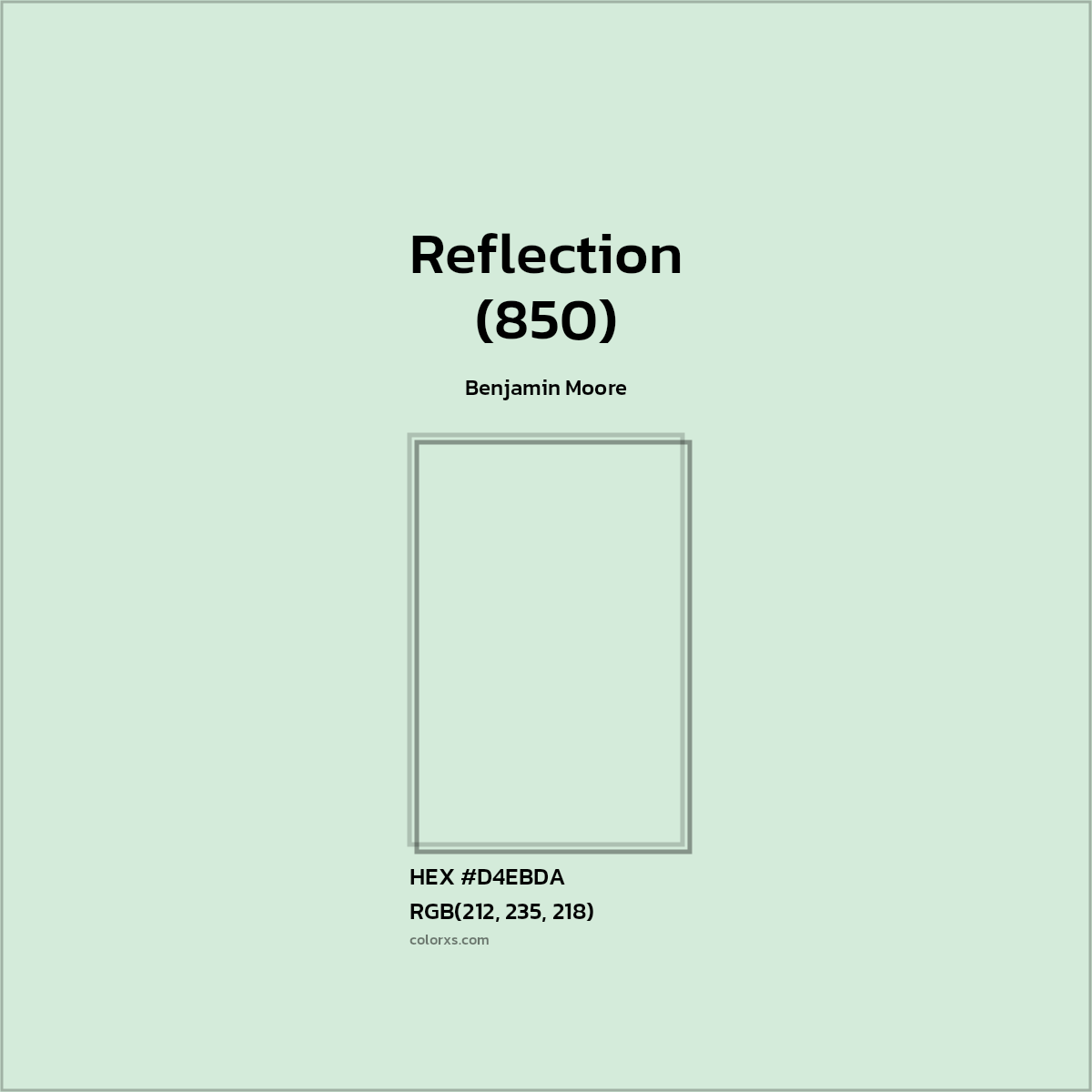 Reflection (850) color belongs to the Green color family (hue). The hexadecimal color code(color number) for Reflection (850) is #D4EBDA, and the RGB color code is RGB(212, 235, 218).