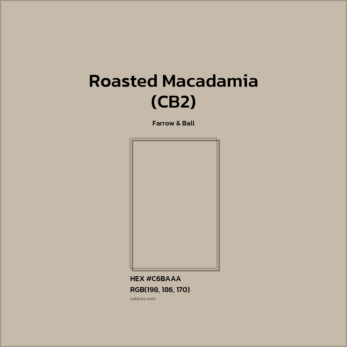 Roasted Macadamia (CB2) color belongs to the Beige Neutral color family (hue). The hexadecimal color code(color number) for Roasted Macadamia (CB2) is #C6BAAA, and the RGB color code is RGB(198, 186, 170).