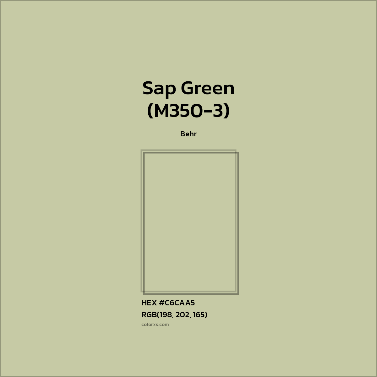 Sap Green (M350-3) color belongs to the Green color family (hue). The hexadecimal color code(color number) for Sap Green (M350-3) is #C6CAA5, and the RGB color code is RGB(198, 202, 165).
