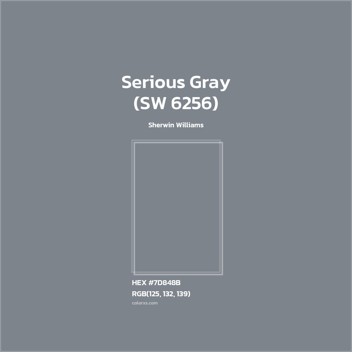 Serious Gray (SW 6256) color belongs to the Neutral Blue Gray Gray color family (hue). The hexadecimal color code(color number) for Serious Gray (SW 6256) is #7D848B, and the RGB color code is RGB(125, 132, 139).