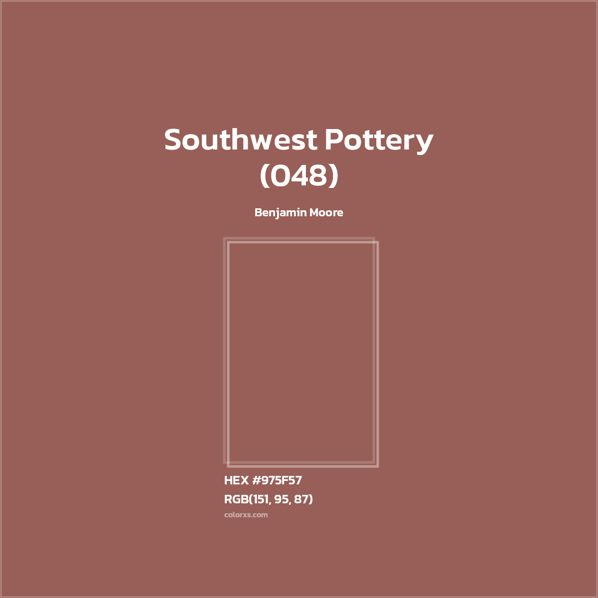 Southwest Pottery (048) color belongs to the Orange color family (hue). The hexadecimal color code(color number) for Southwest Pottery (048) is #975F57, and the RGB color code is RGB(151, 95, 87).