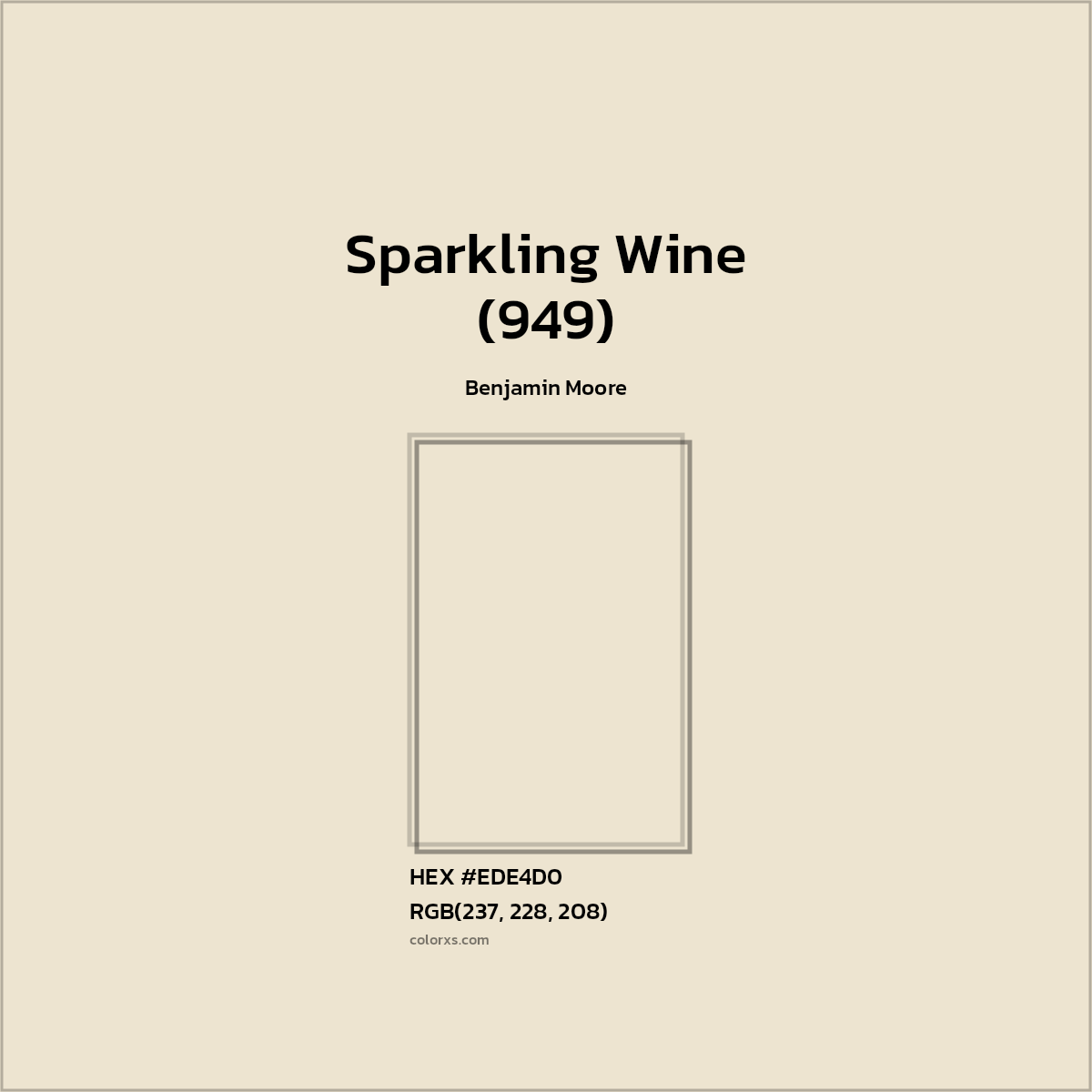 Sparkling Wine (949) color belongs to the Neutral color family (hue). The hexadecimal color code(color number) for Sparkling Wine (949) is #EDE4D0, and the RGB color code is RGB(237, 228, 208).