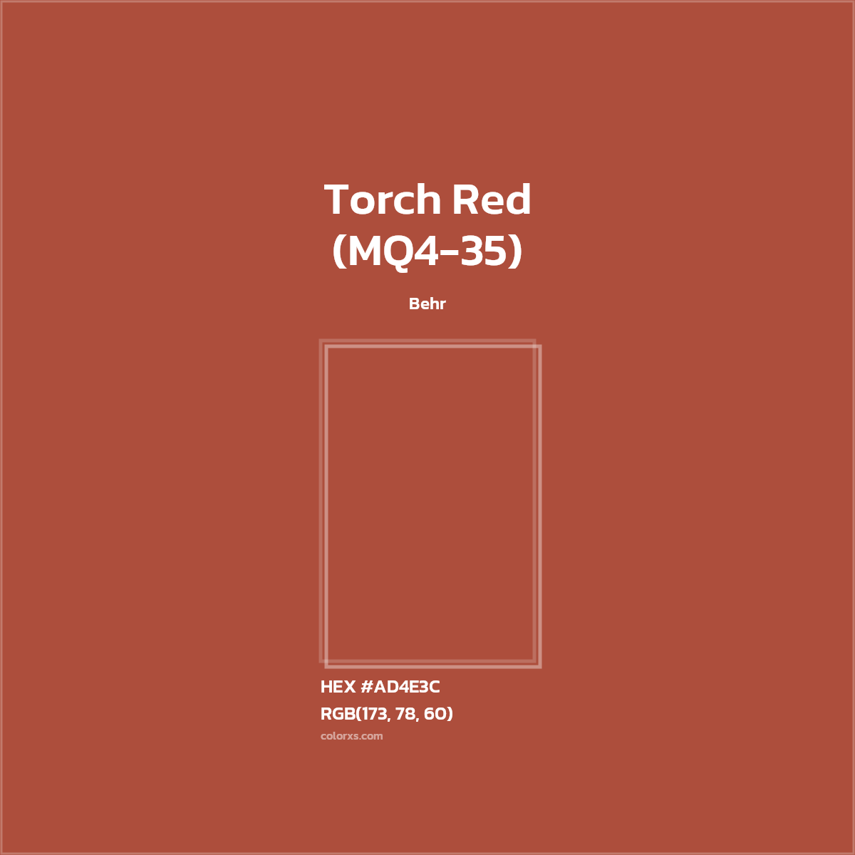 Torch Red (MQ4-35) color belongs to the Red color family (hue). The hexadecimal color code(color number) for Torch Red (MQ4-35) is #AD4E3C, and the RGB color code is RGB(173, 78, 60).