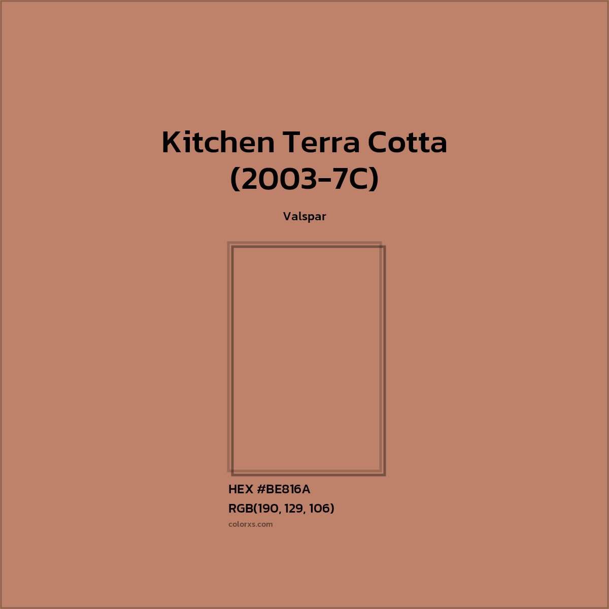 Kitchen Terra Cotta (2003-7C) color belongs to the red color family (hue). The hexadecimal color code(color number) for Kitchen Terra Cotta (2003-7C) is #BE816A, and the RGB color code is RGB(190, 129, 106).