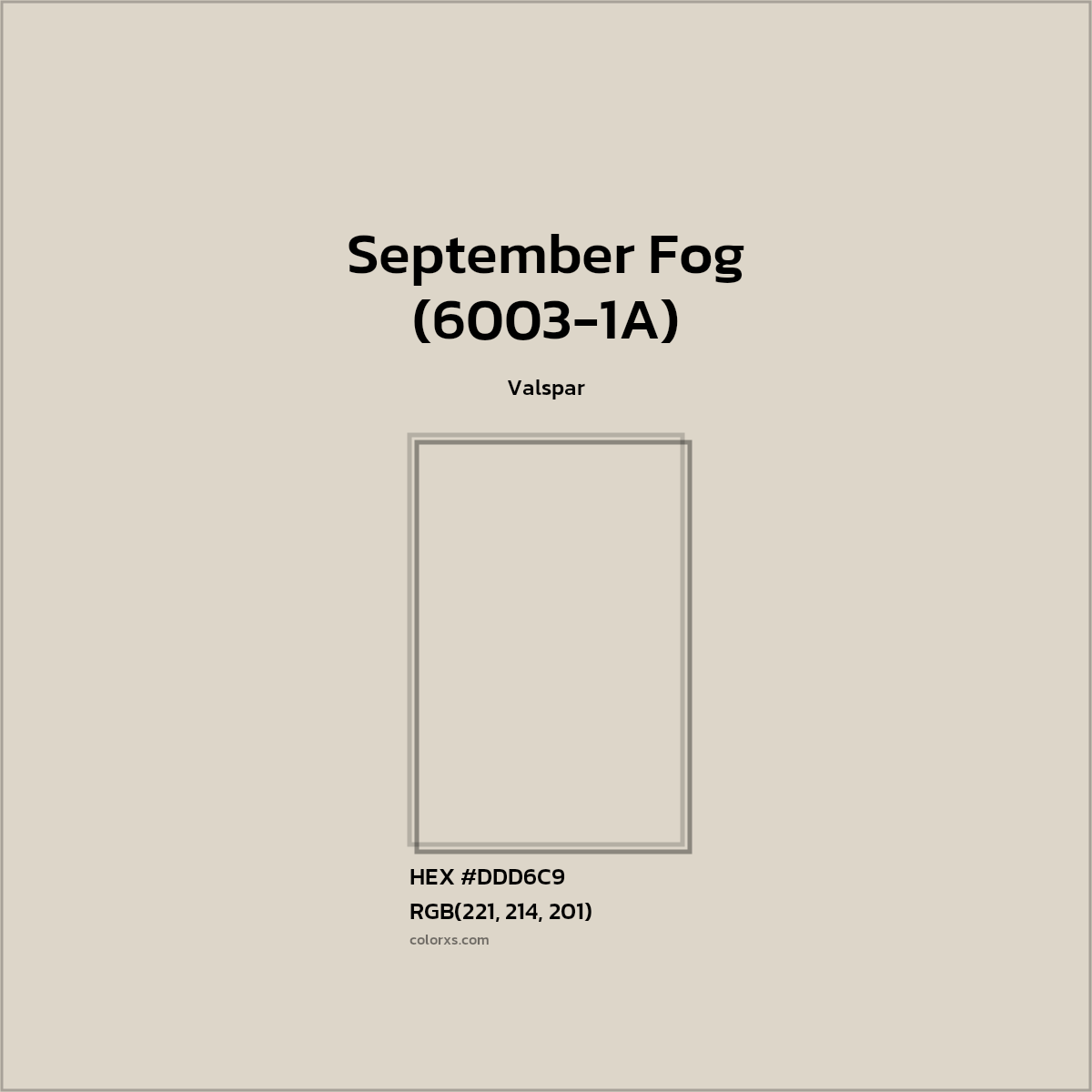 September Fog (6003-1A) color belongs to the neutral color family (hue). The hexadecimal color code(color number) for September Fog (6003-1A) is #DDD6C9, and the RGB color code is RGB(221, 214, 201).